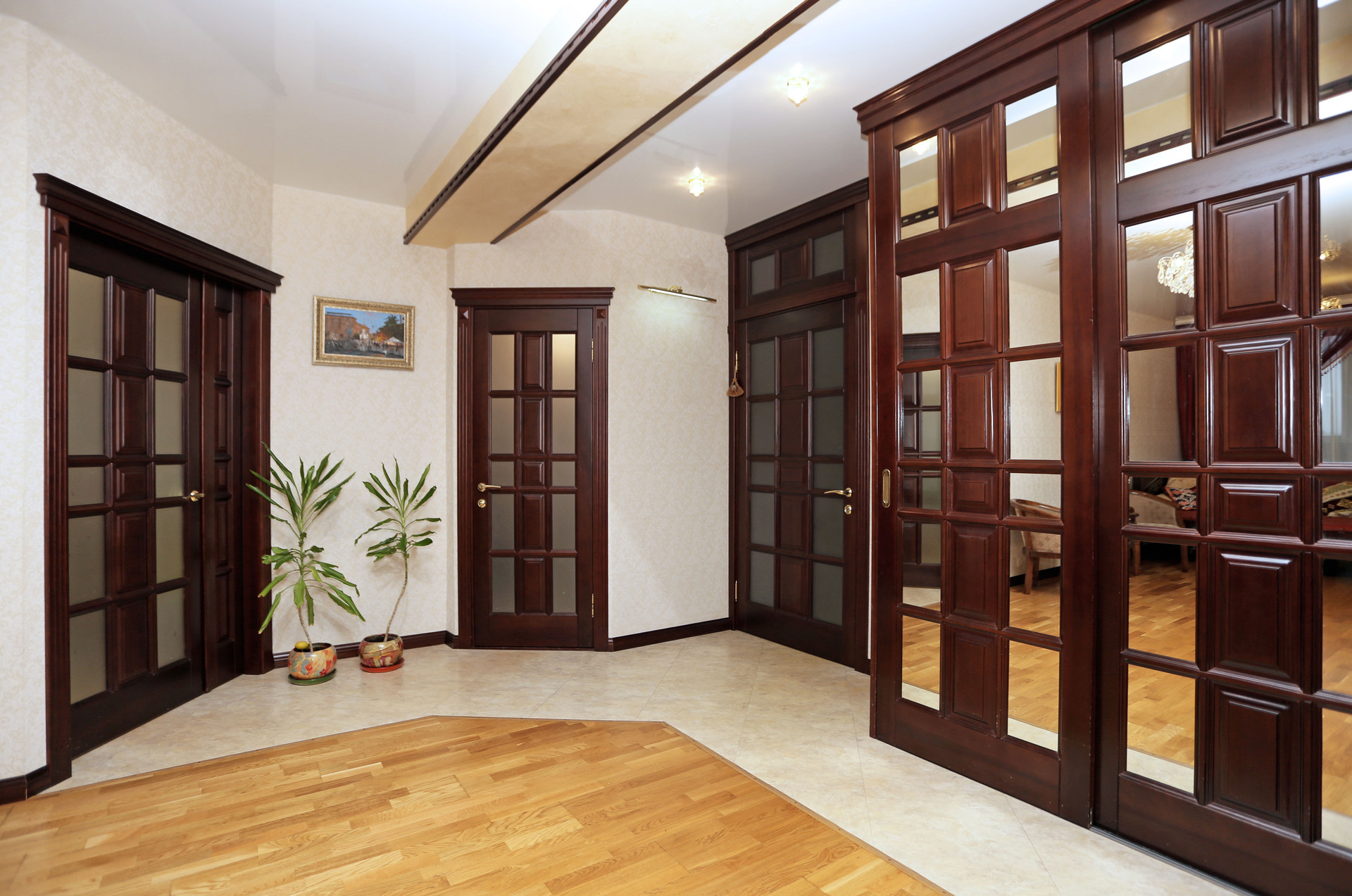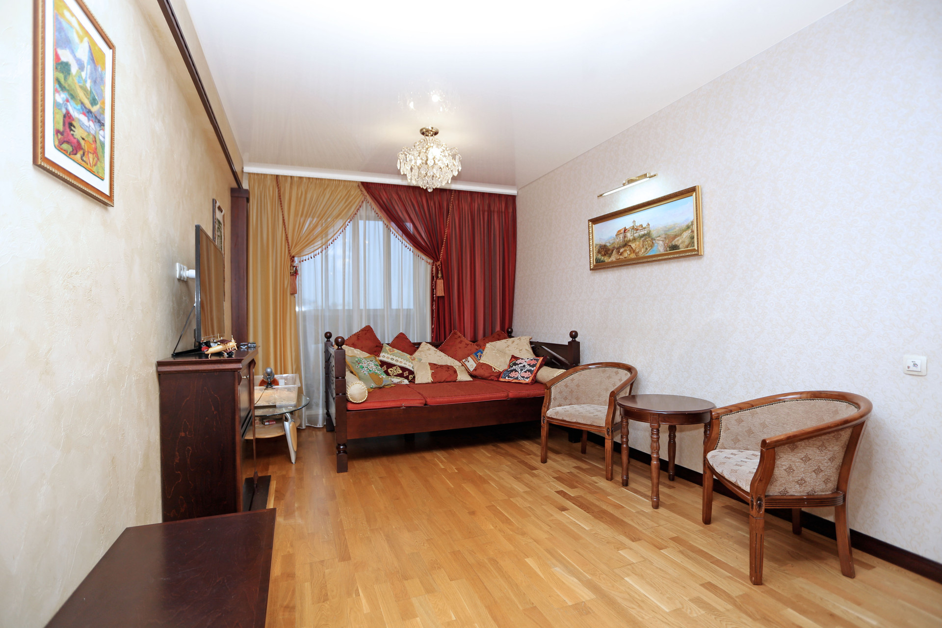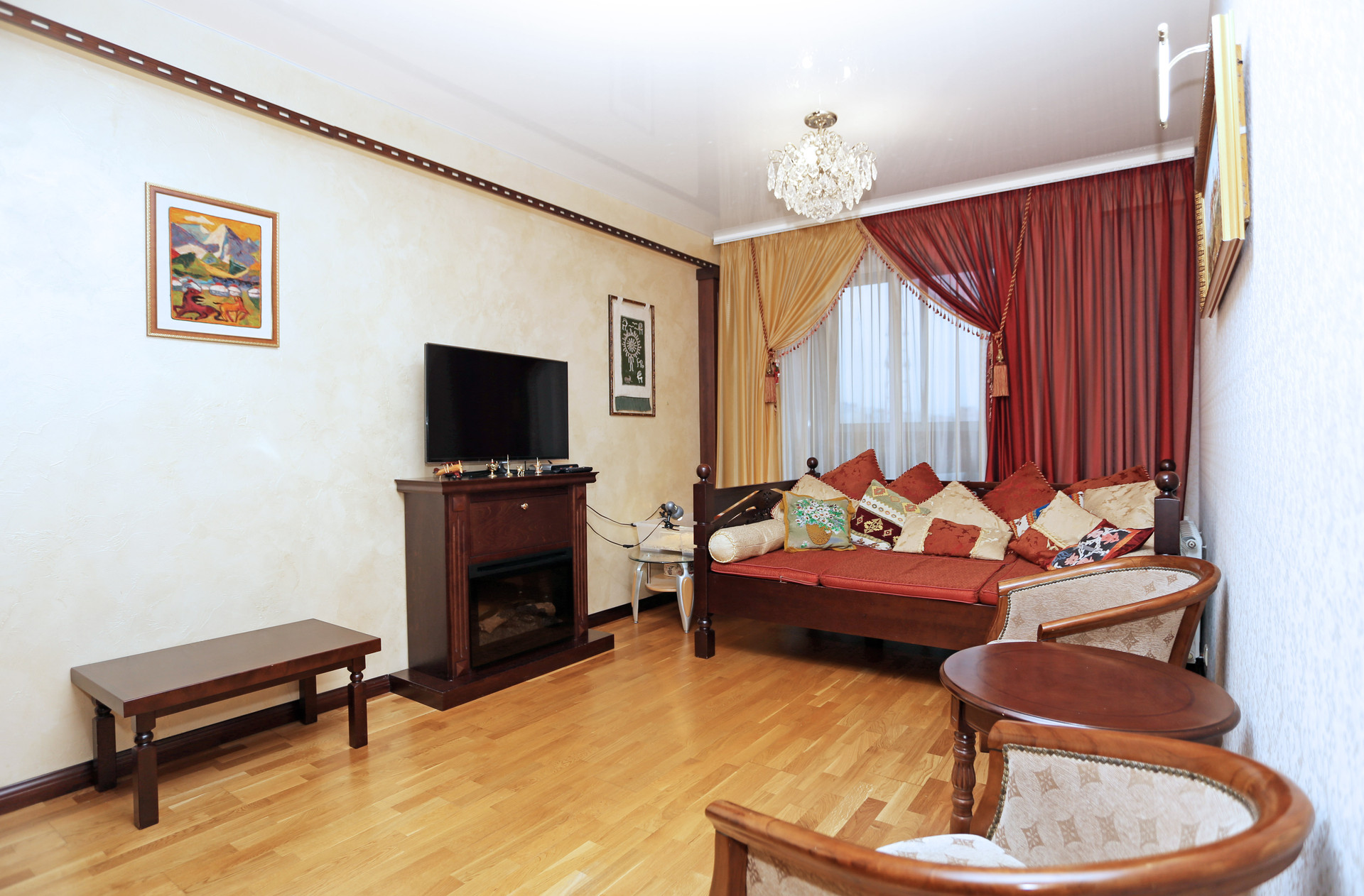 В отделке  использованы только качественные натуральные материалы- паркетная доска;  двери ,  мебель и элементы декора - из массива дерева.