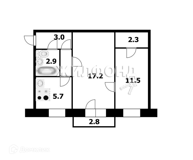 Жилая площадь 28.7 м2