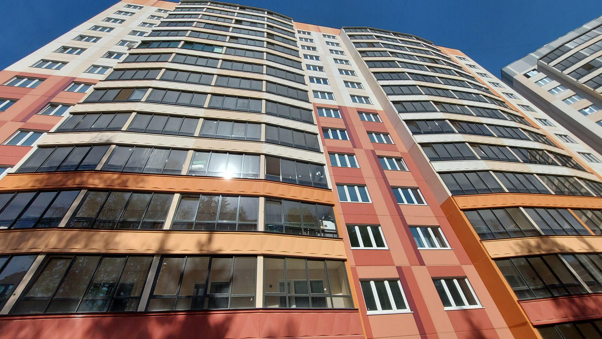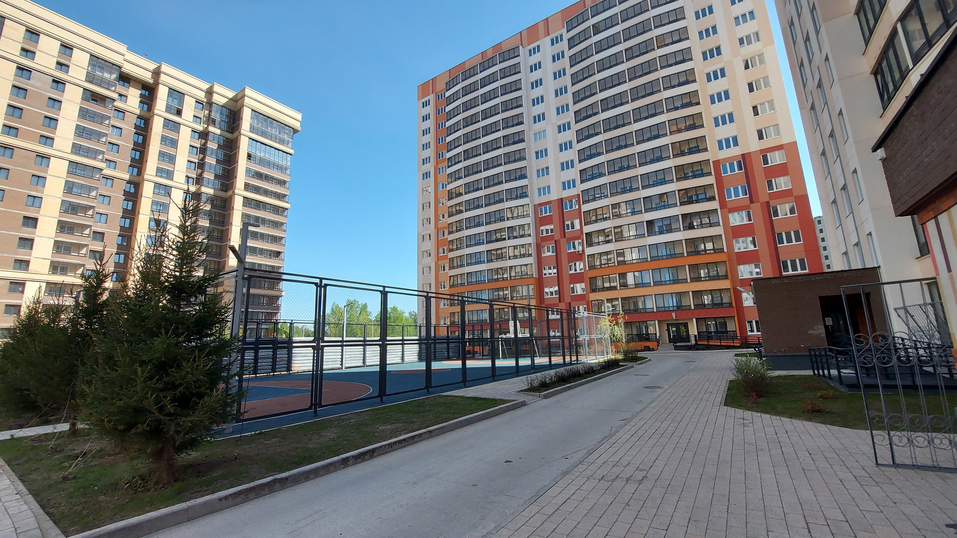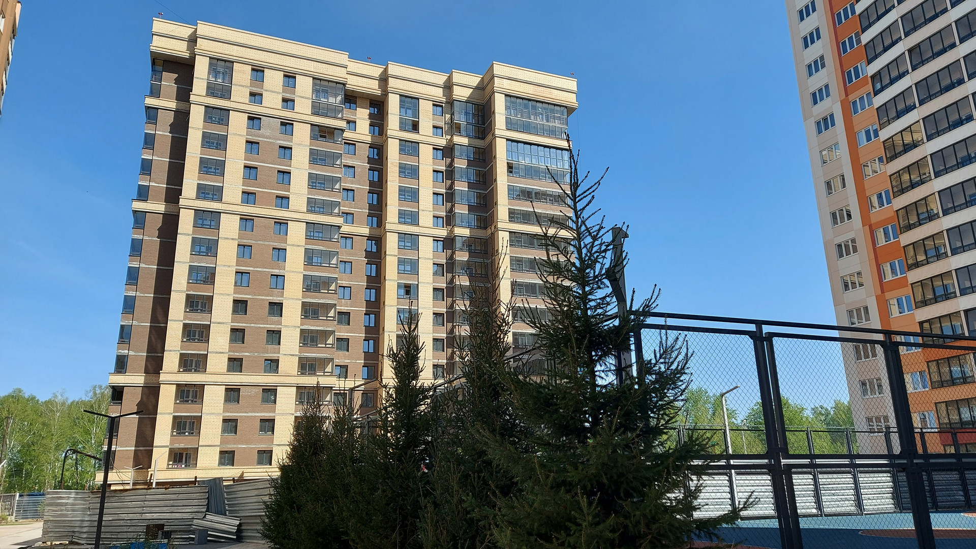 Хорошее расположение дома, кирпичный фасад, благоустроенная придомовая территория с детскими и спортивной площадками.