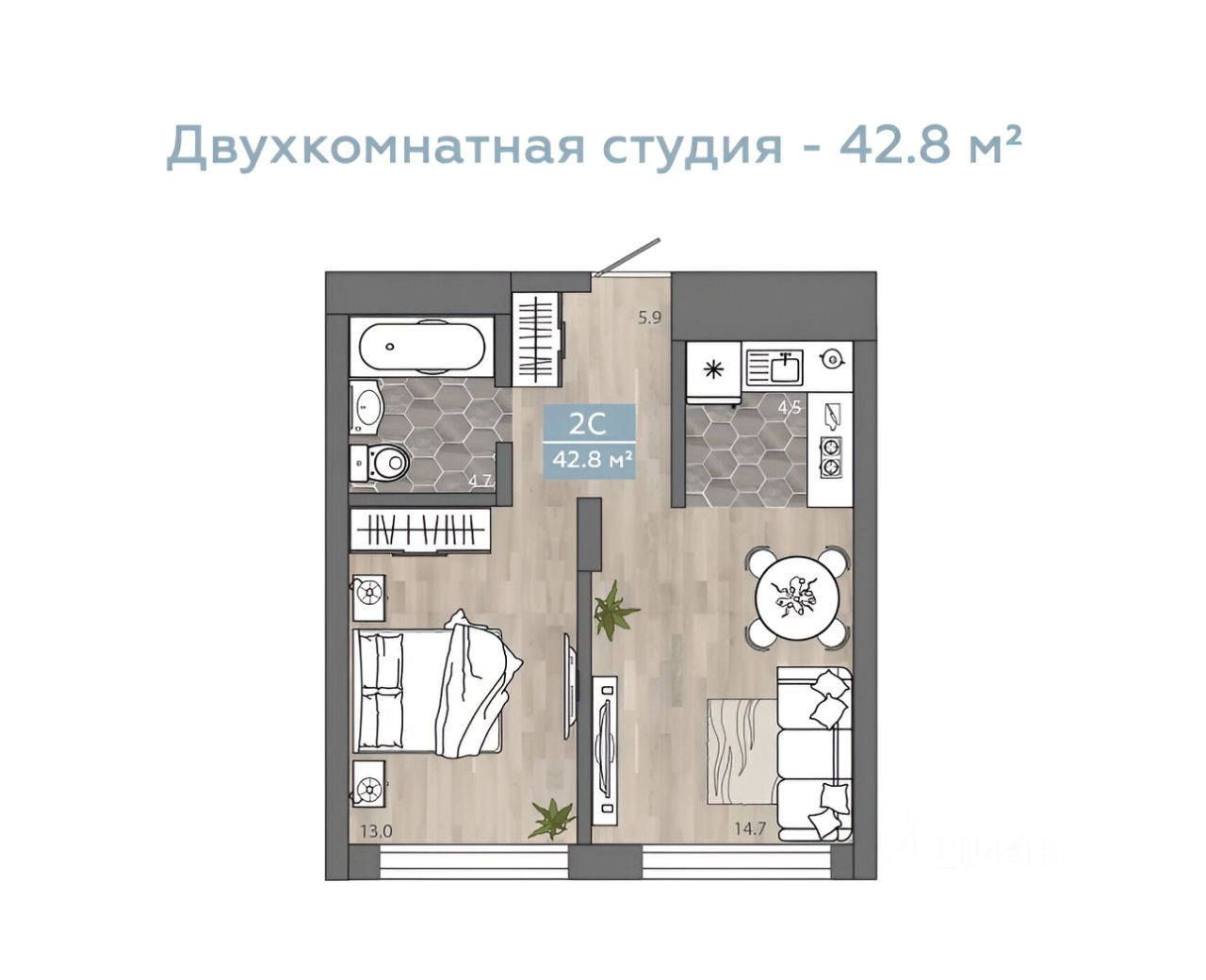 Общая площадь 43 м2