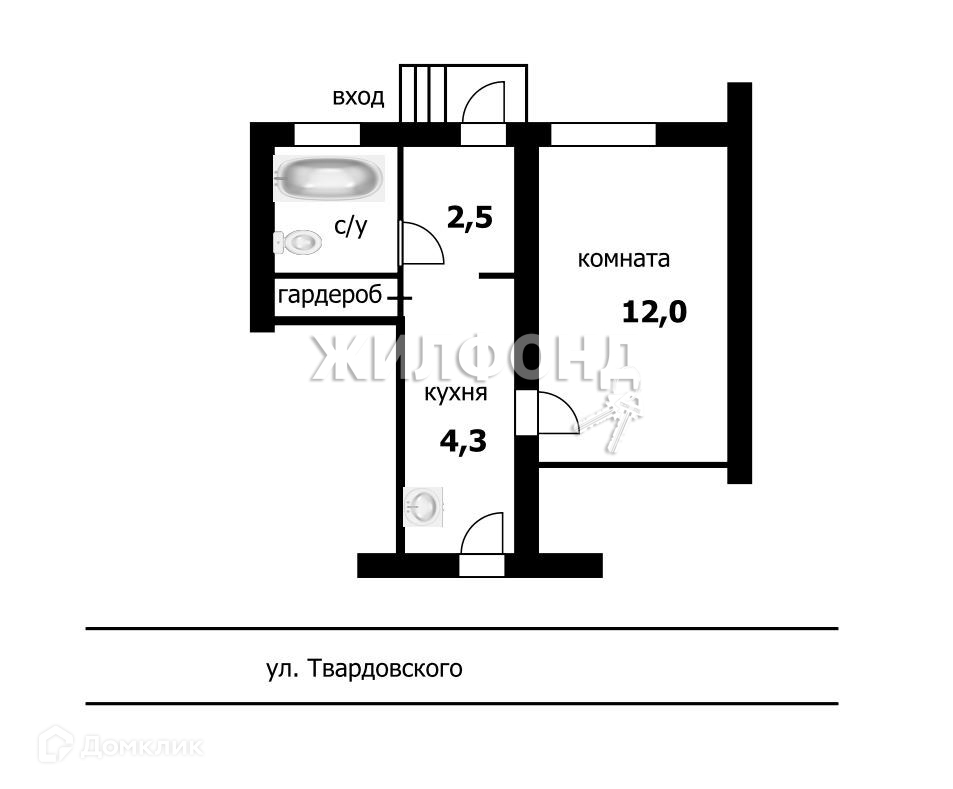 1-комнатная квартира, 24.4 м2, этаж 1 / 5, на продажу в Новосибирске, улица Твардовского, 8