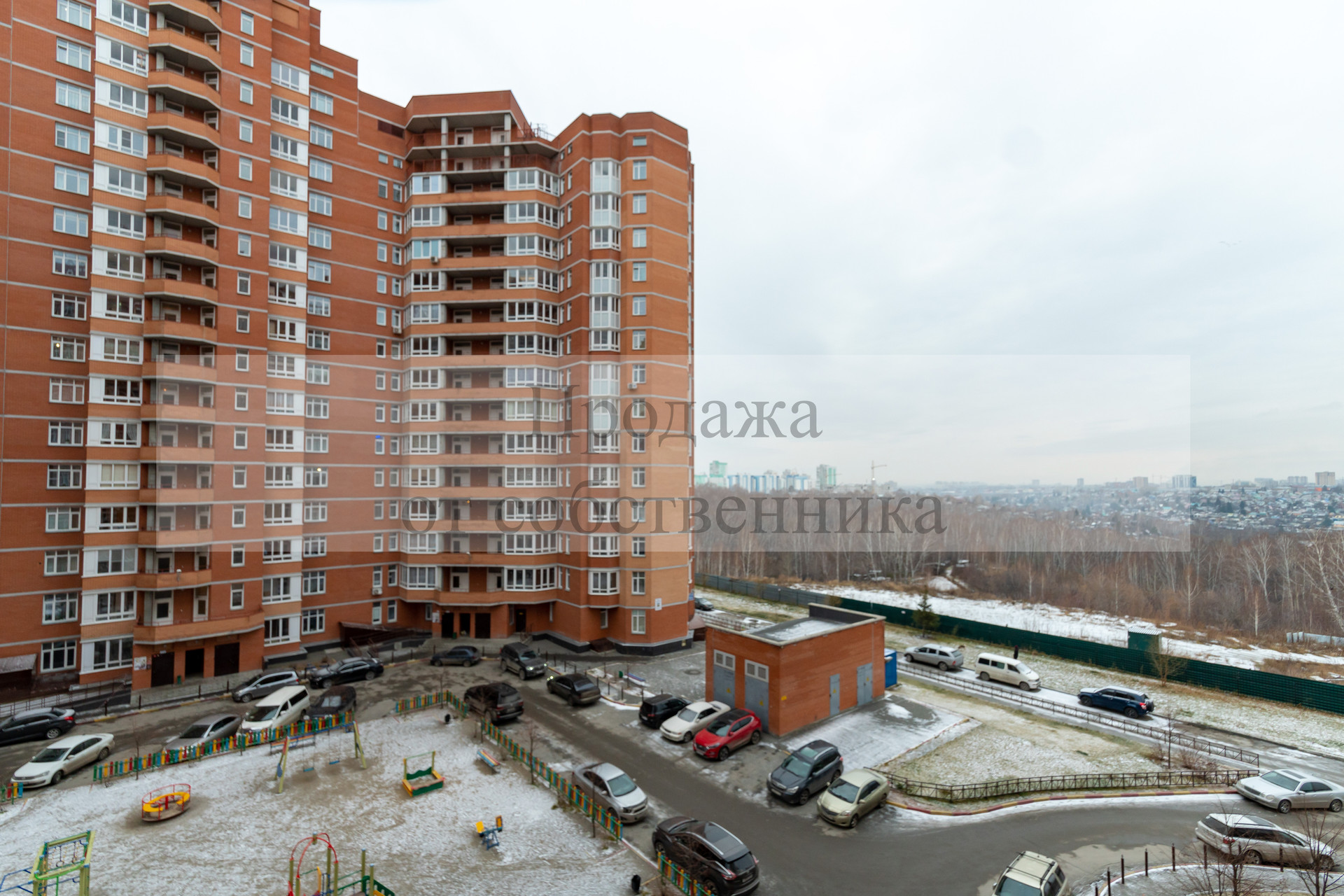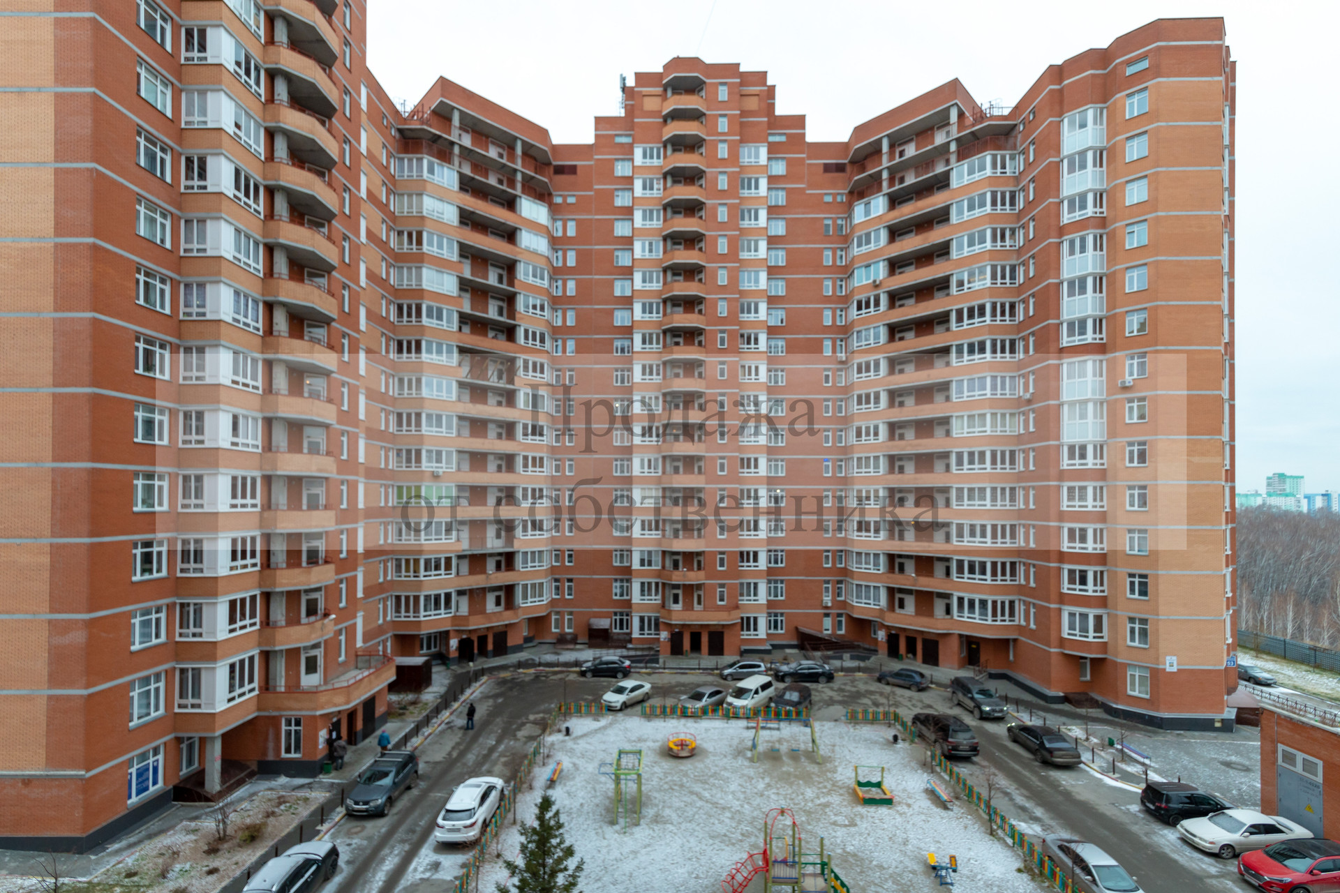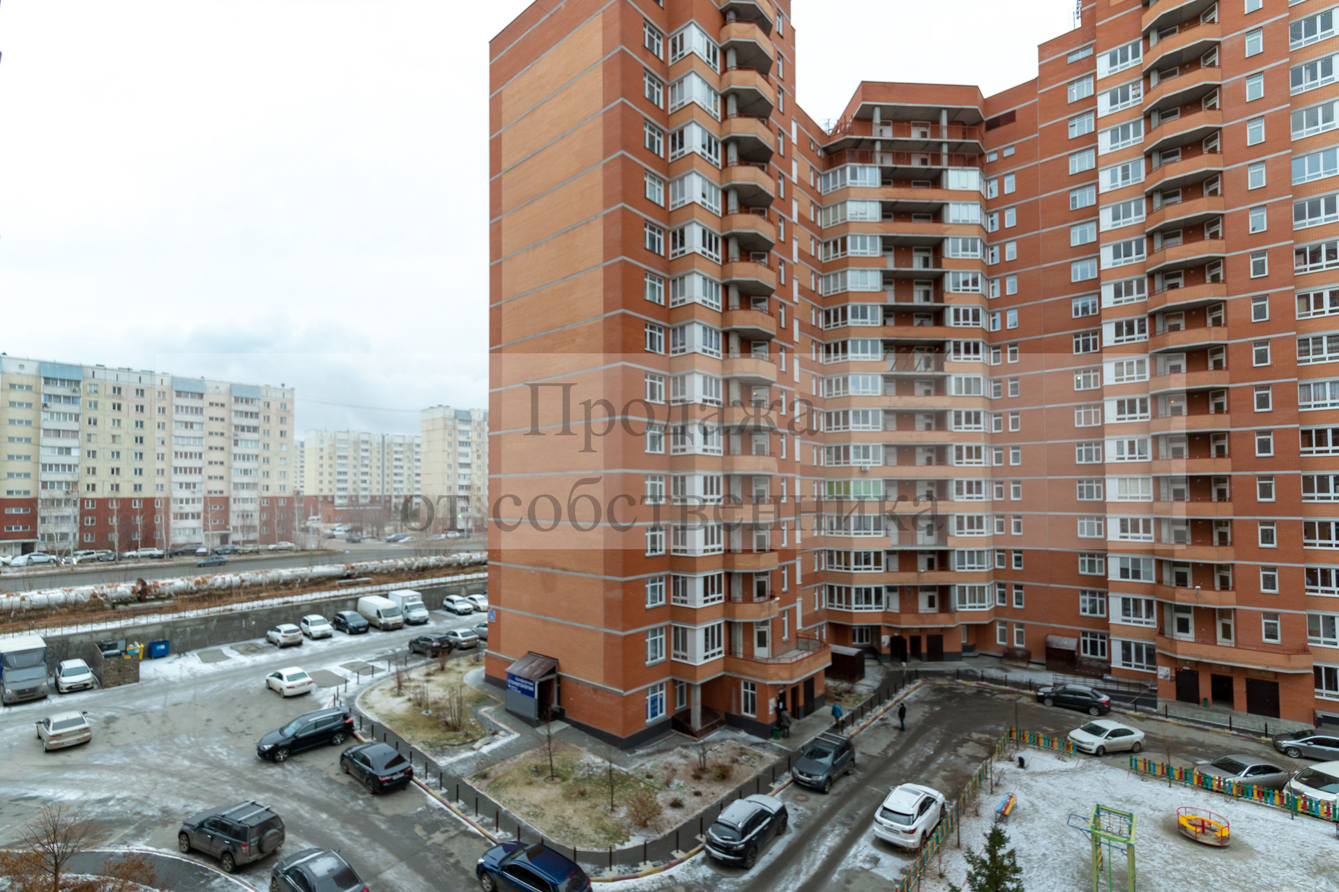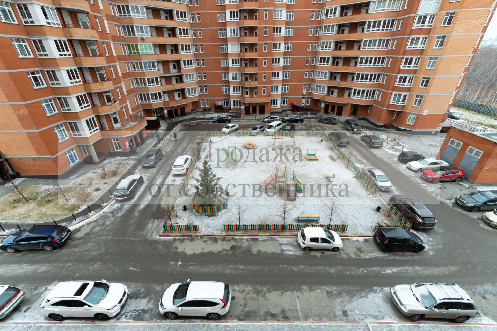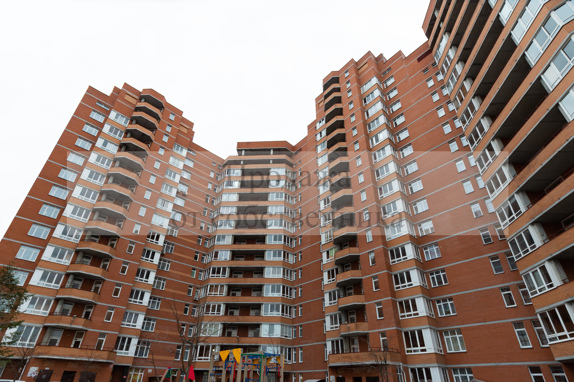 кирпичный дом с благоустроенной детской площадкой во дворе,