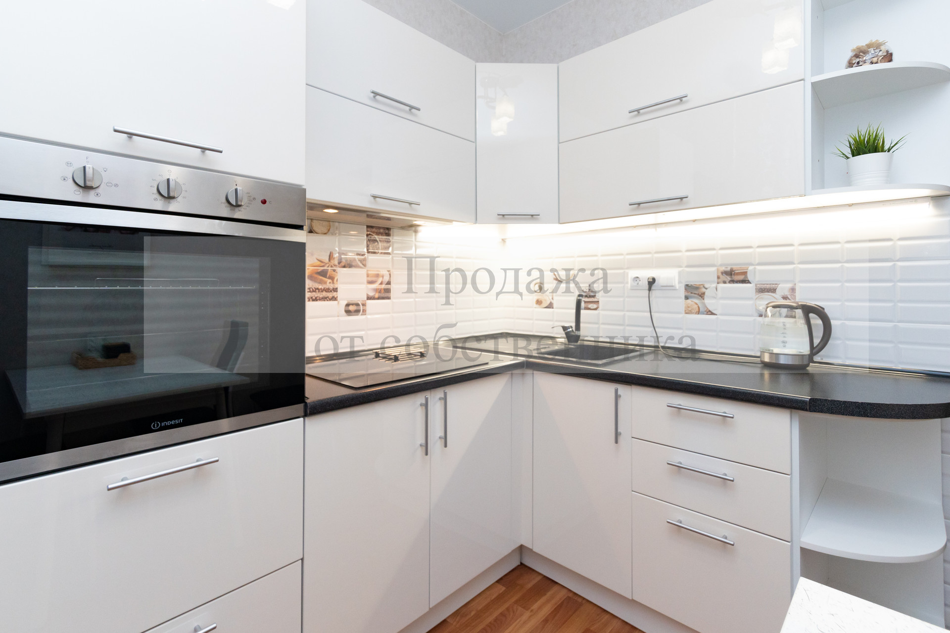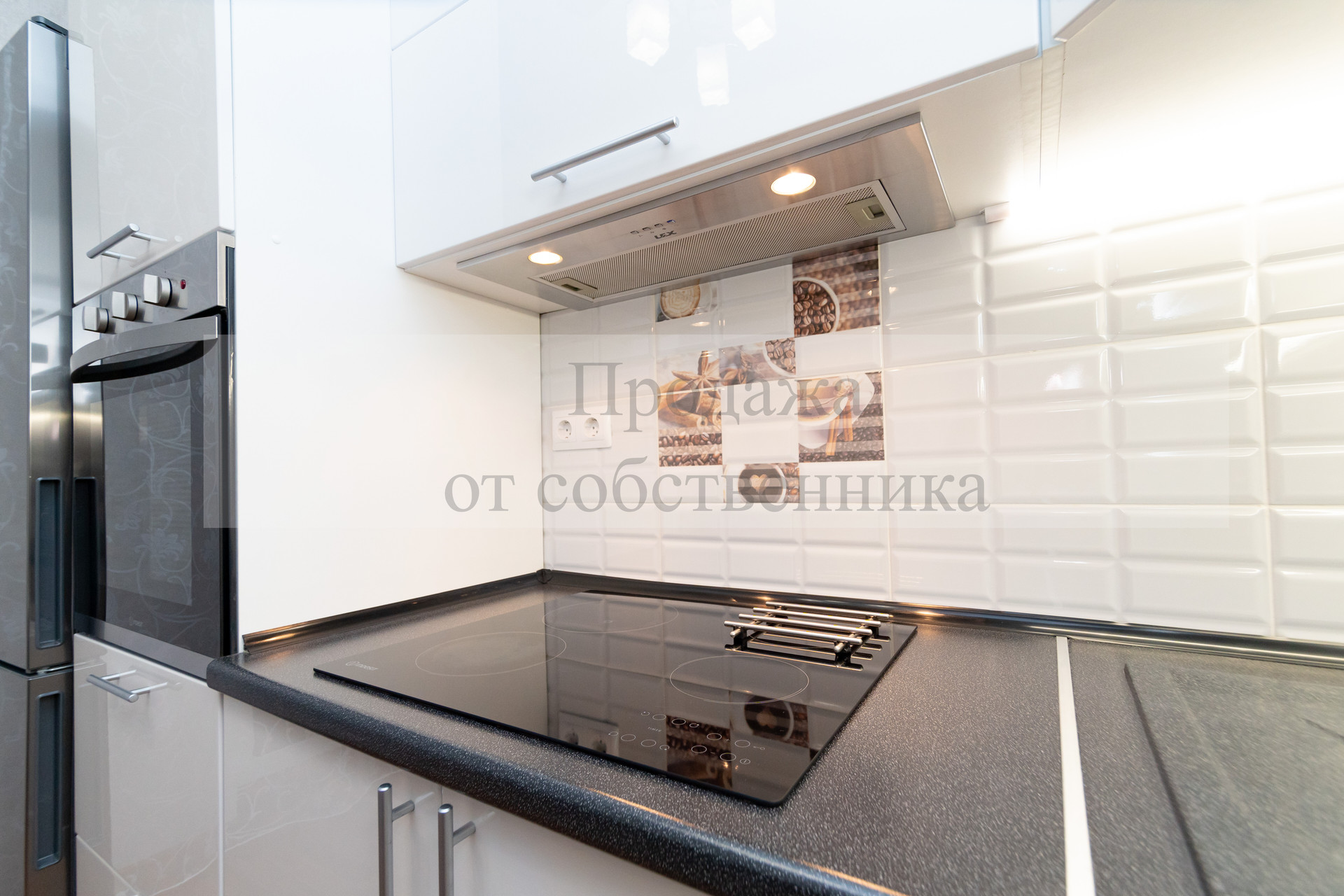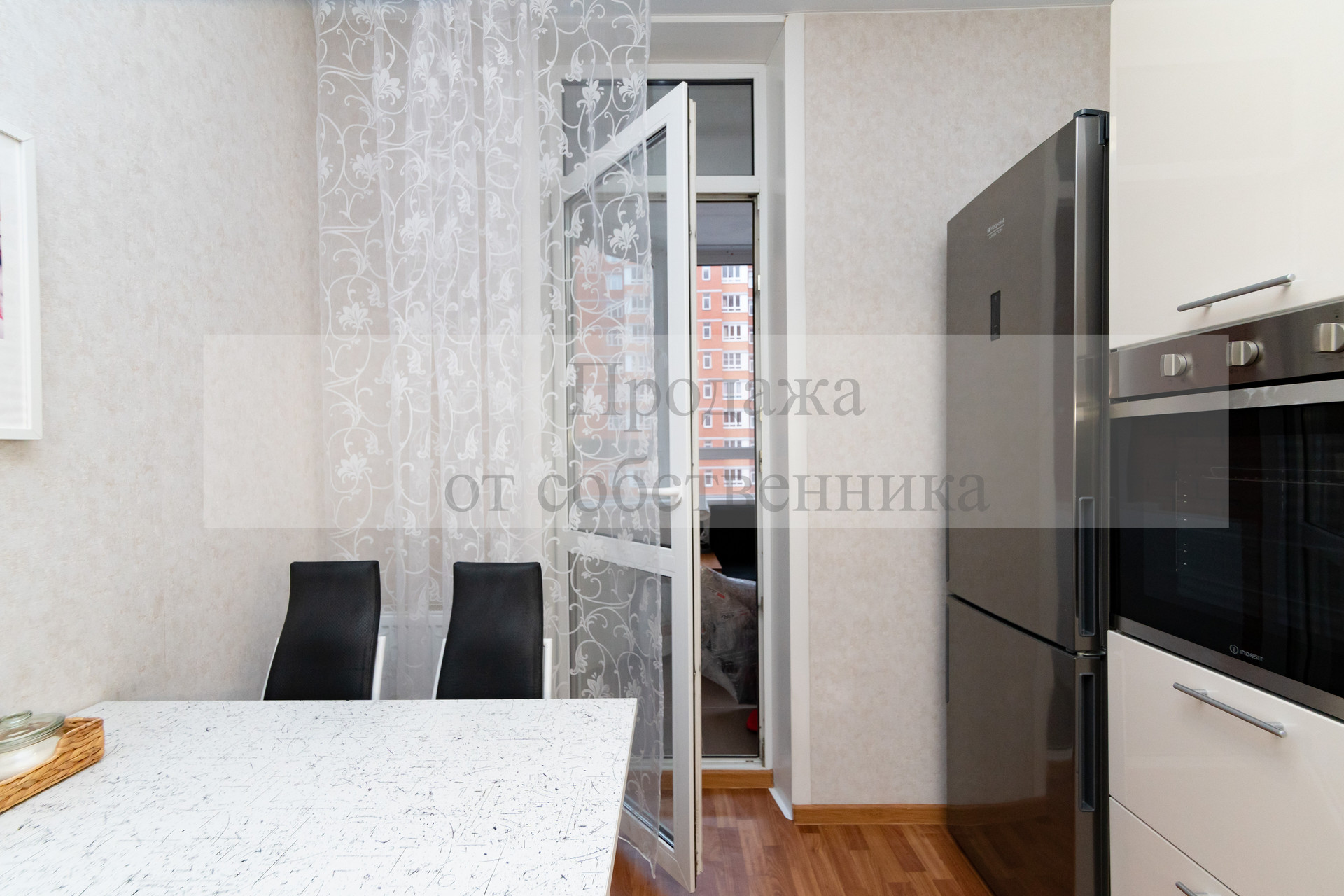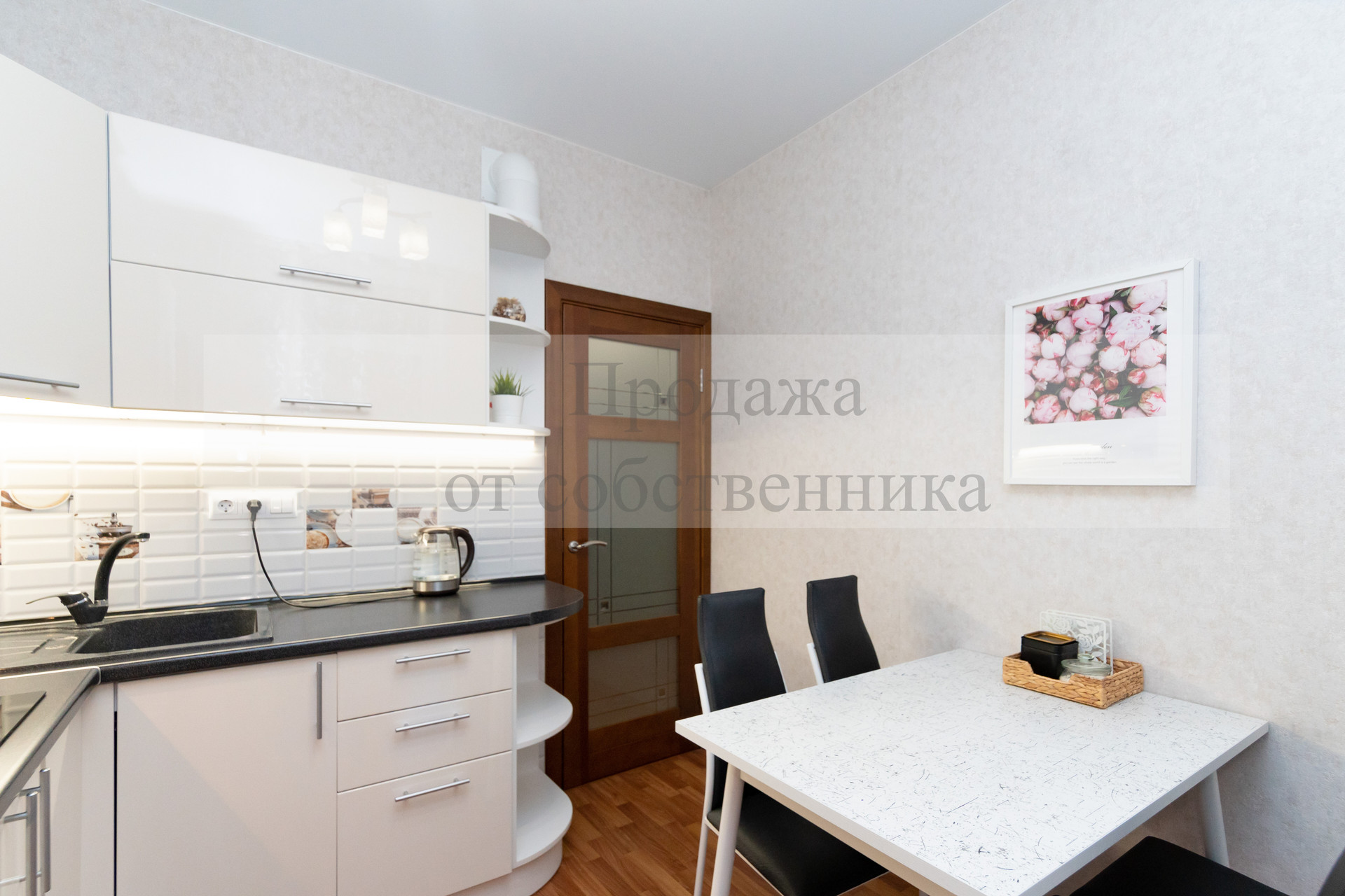 Кухня квадратной формы с современным кухонным гарнитуром и встроенной техникой, дополнительной подсветкой рабочей поверхности, качественные входная и межкомнатные (из массива дерева) двери, утепленная лоджия (где можно обустроить рабочий кабинет).