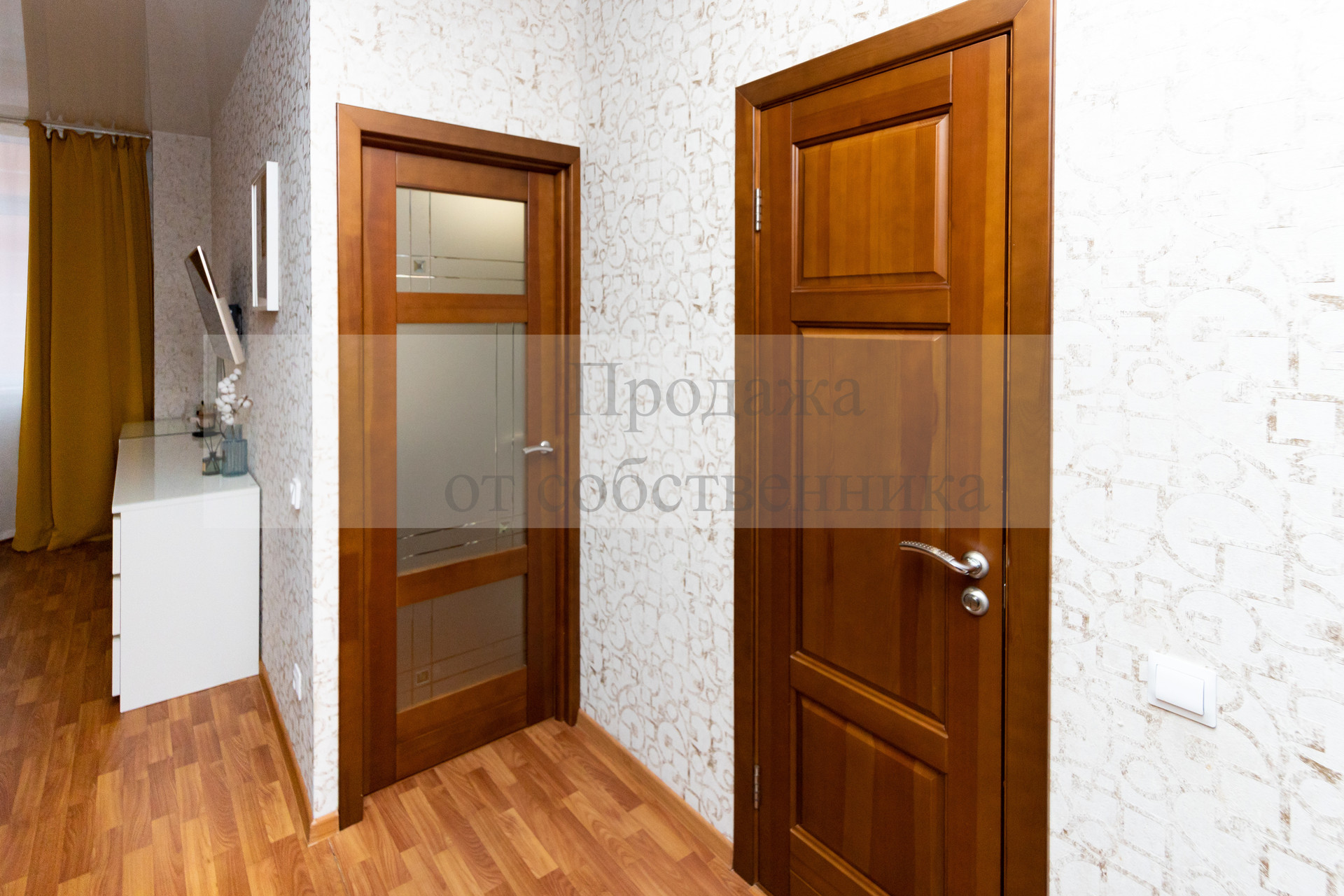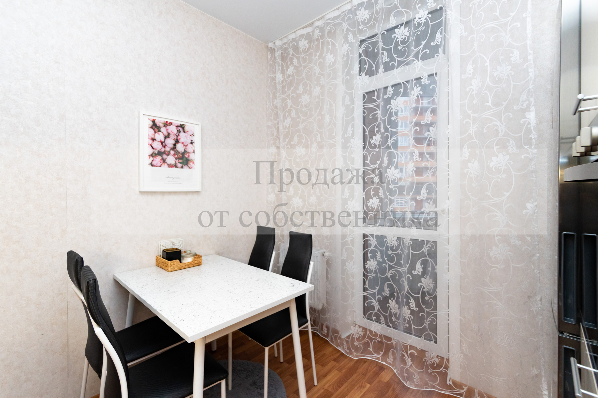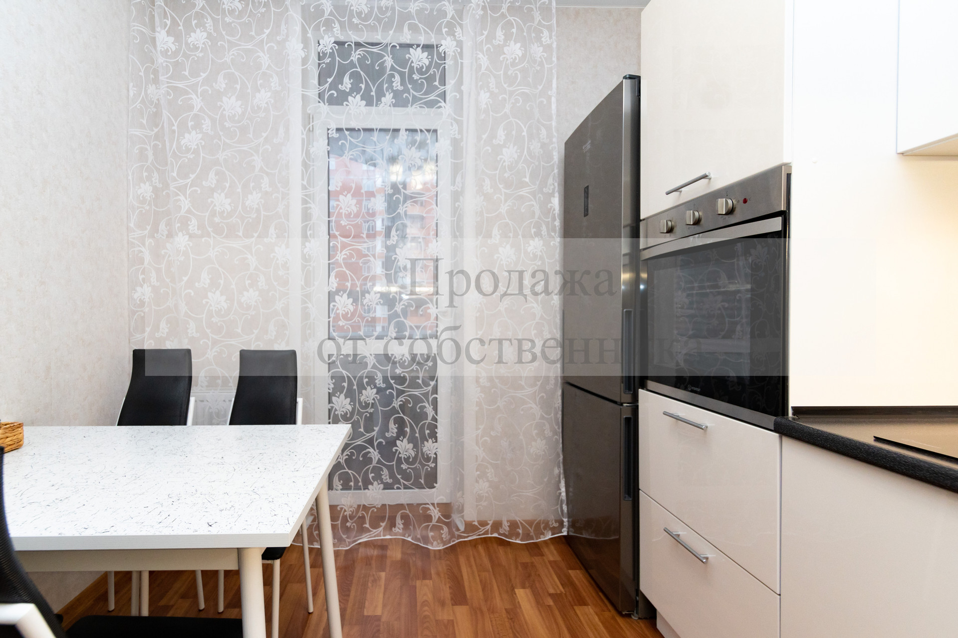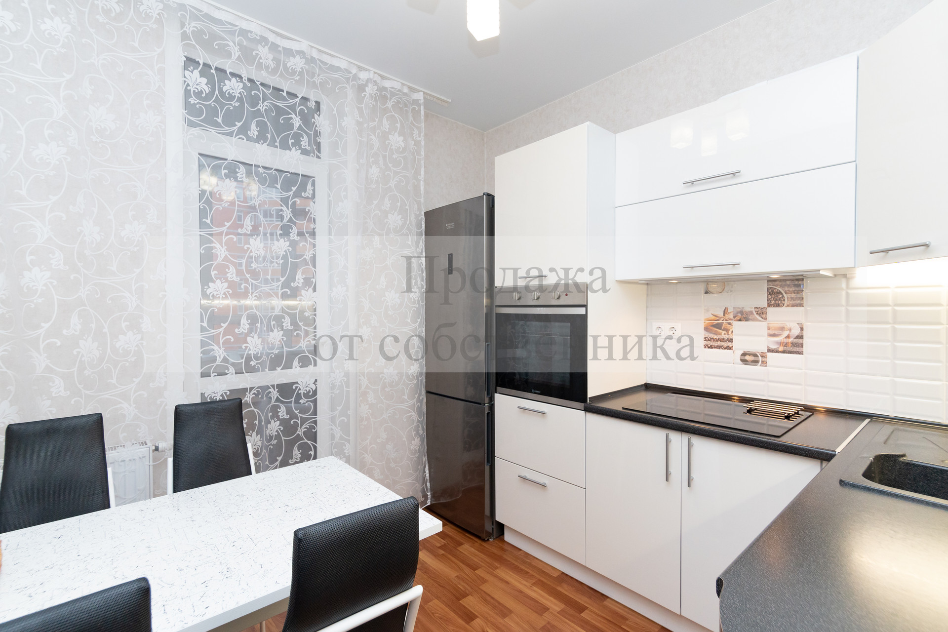 Кухня квадратной формы с современным кухонным гарнитуром и встроенной техникой, дополнительной подсветкой рабочей поверхности, качественные входная и межкомнатные (из массива дерева) двери, утепленная лоджия (где можно обустроить рабочий кабинет).