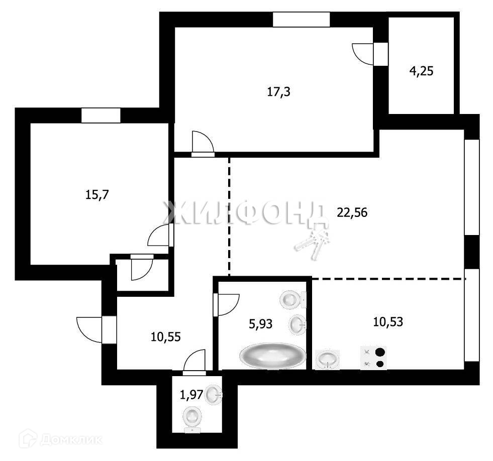 Общая площадь квартиры (без учёта лоджии) 84,8 кв.м. Две спальни: 15,7 и 17,3 кв.м. , просторная кухня — гостиная 33 кв.м.