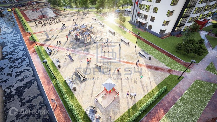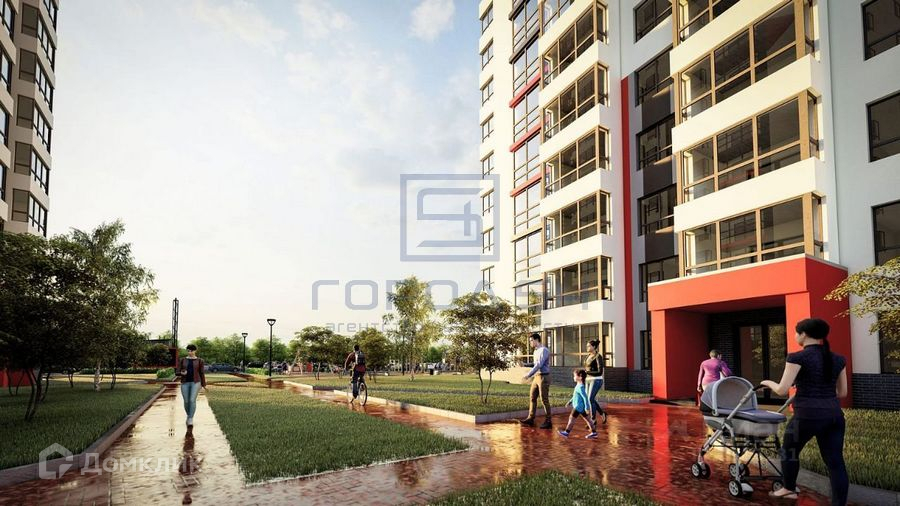 Современный жилой комплекс с огороженной территорией, детскими площадками, большим количеством парковочных мест по периметру комплекса.