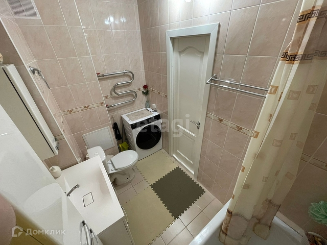 смежный санузел, пол и стены выложены кафелем.
