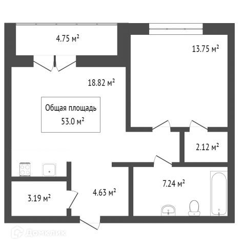 Общая площадь 52.5 м2