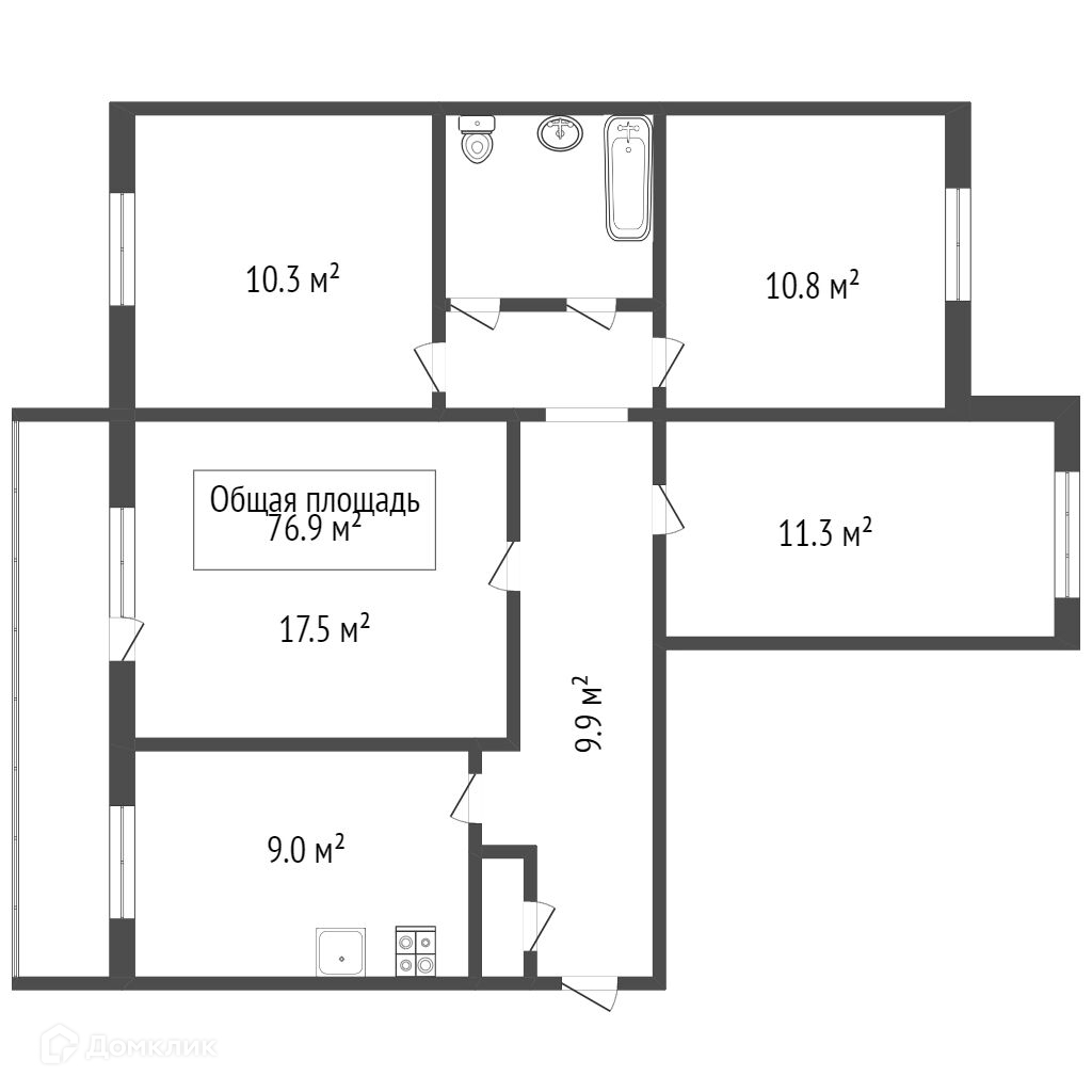 Предлагается к продаже 4 комнатная квартира. Площадь: общая 76,9 м2, кухня 9 м2, комнаты 17.5 м2,10,3 м2, 10,8м2 и 11,3м2.