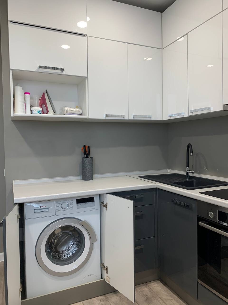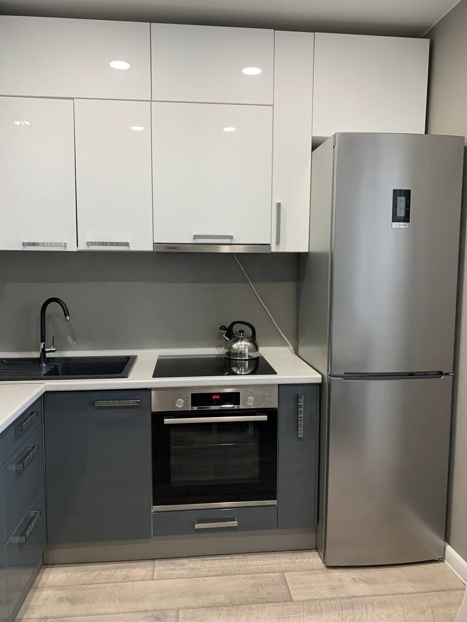 В квартире есть новая бытовая техника Bosch, посуда, столовые приборы.