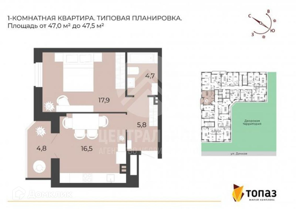 1-комнатная квартира, 47.5 м2, этаж 5 / 25, на продажу в Новосибирске, Дачная улица, 42