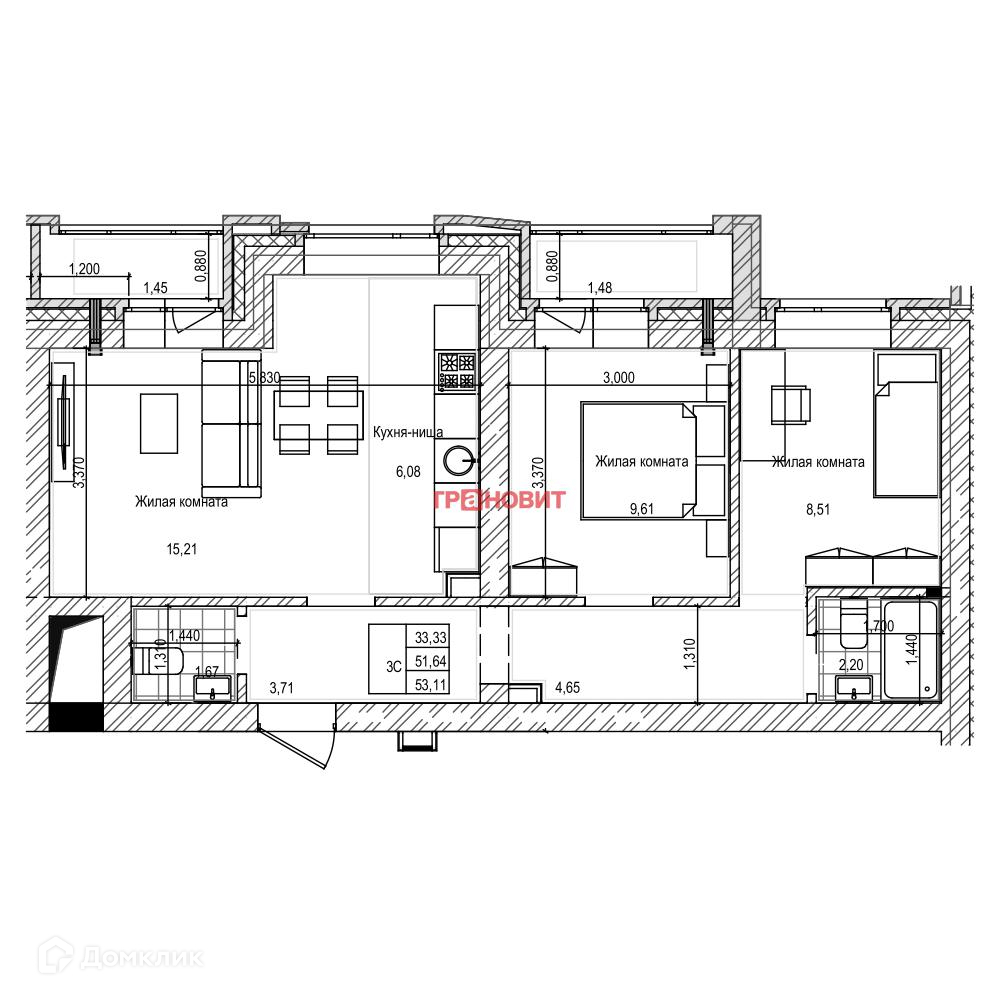 Общая площадь 51.6 м2