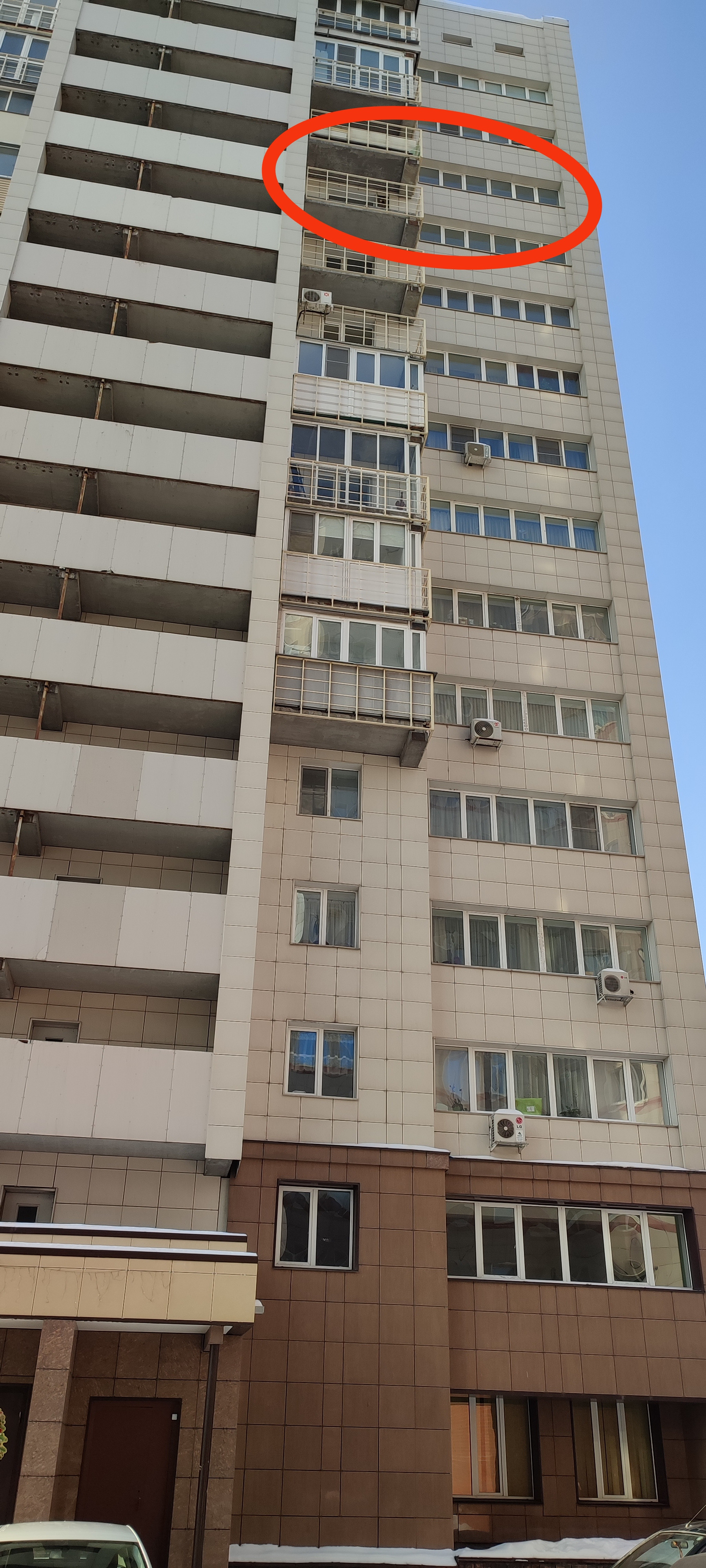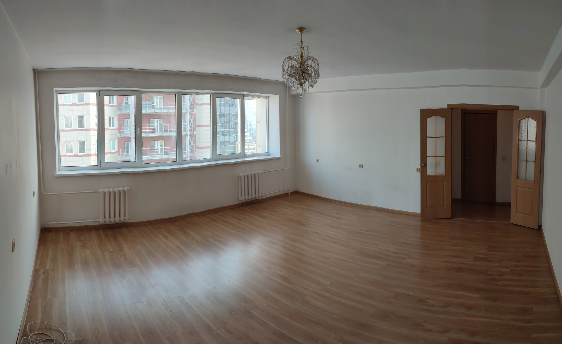 Огромный - 33 кв.м. светлый зал и 6-ти метровое окно. Два балкона, по одному на каждую сторону квартиры.