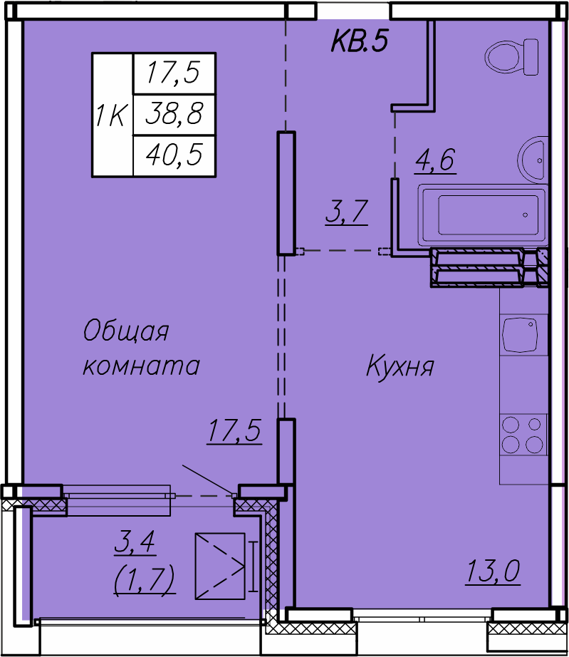 Общая площадь 40.5 м2