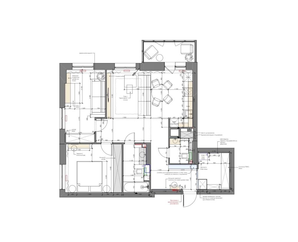 Квартира переделана в трехкомнатную студию, можно вернуть стену и сделать полноценную трехкомнатную квартиру.