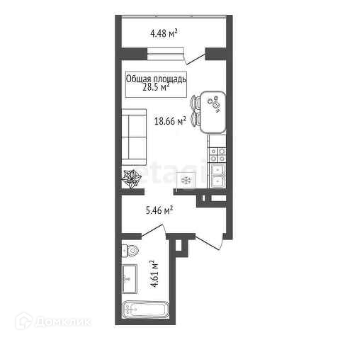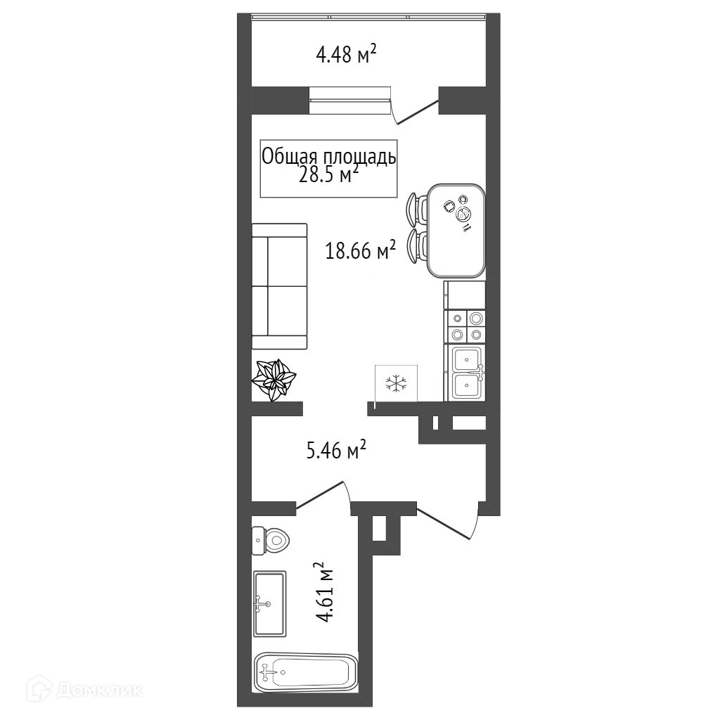 В продаже просторная студия 28.5 кв. м в новом доме.