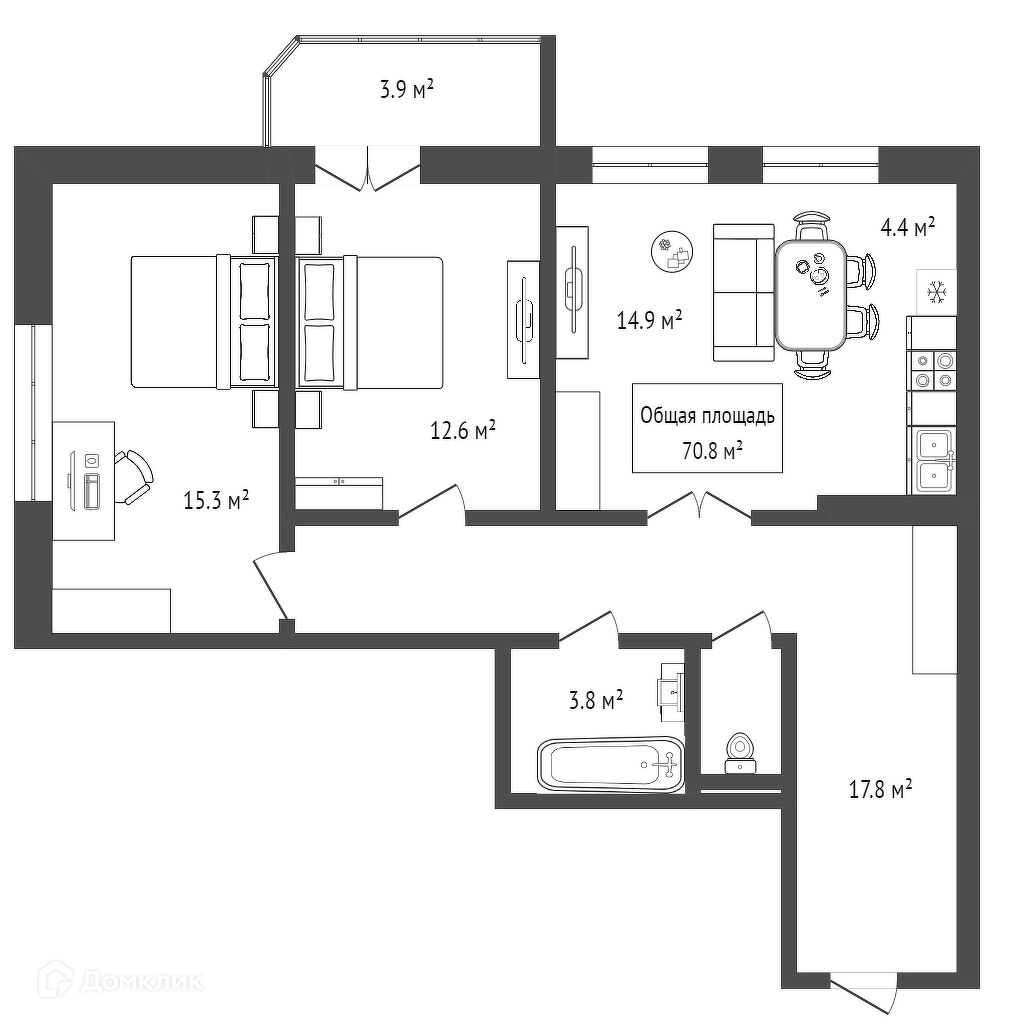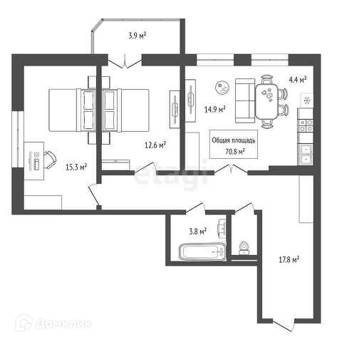 Общая площадь 70.8 м2