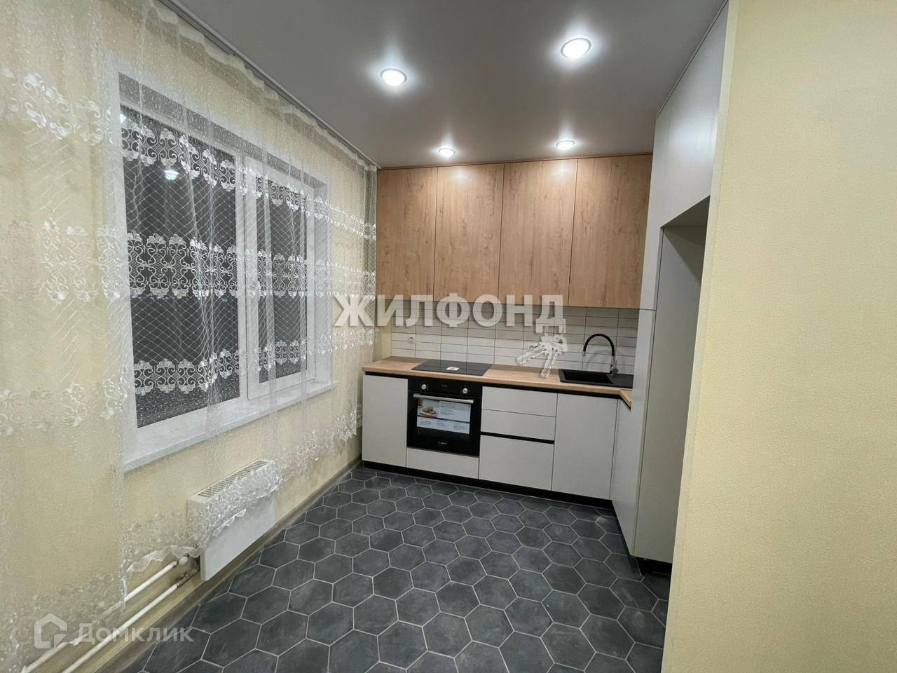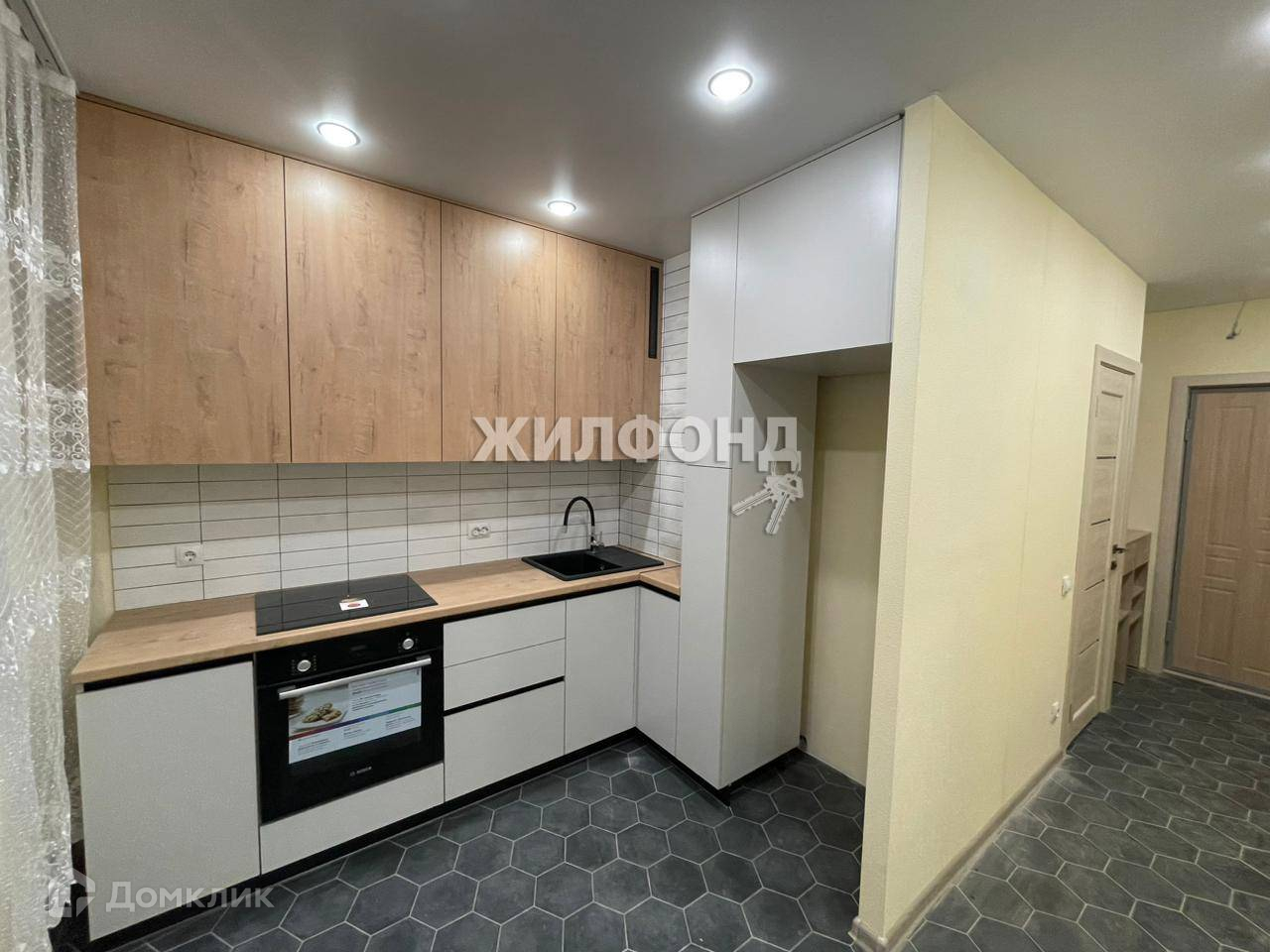 В квартире выполнен современный ремонт с использованием качественных материалов, приобретена вся необходимая мебель и техника - варочная поверхность с духовым шкафом, холодильник, стиральная машина.