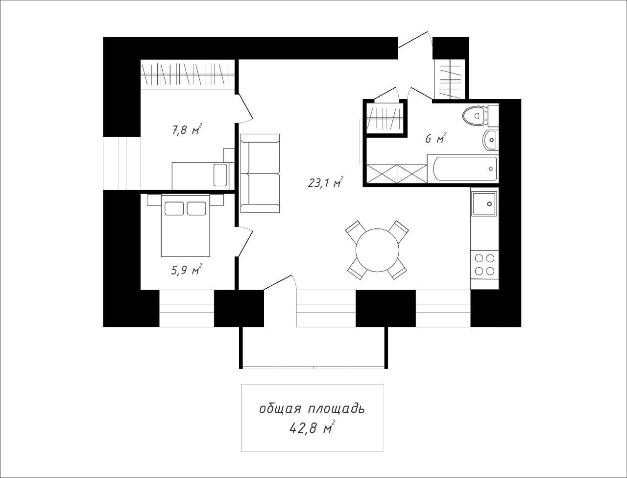 Общая площадь 42.8 м2
