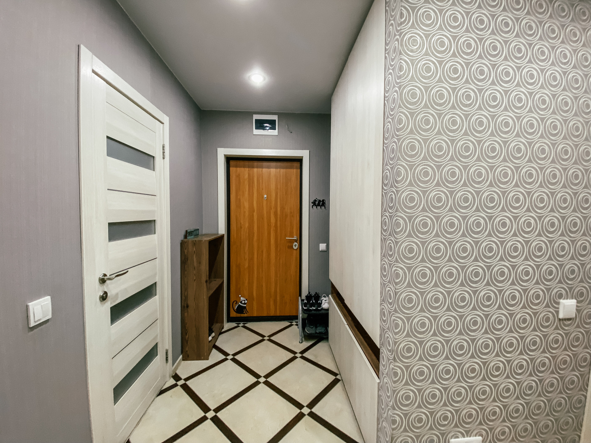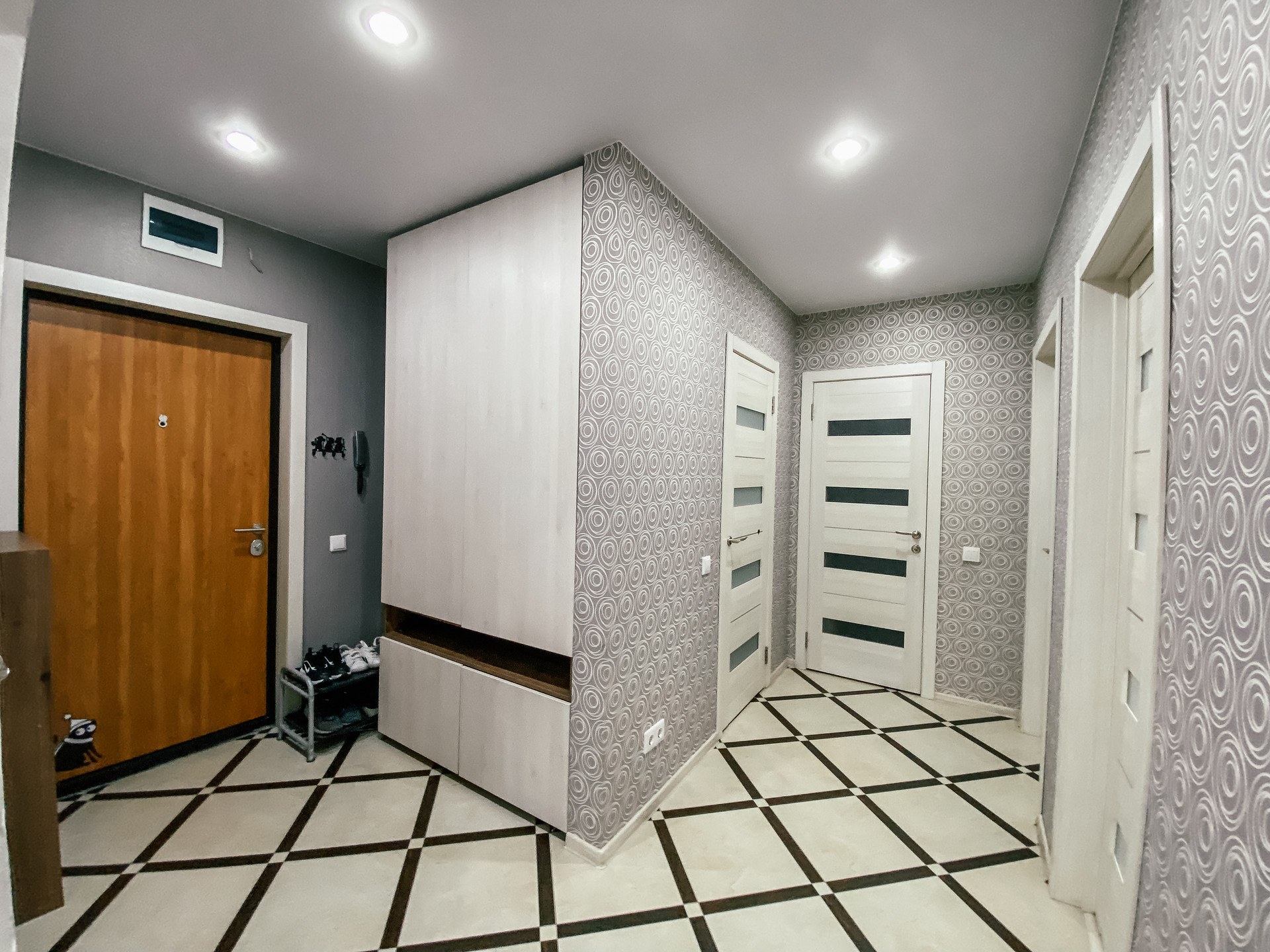 Холл первого этажа отделан крупнолистовым керамогранитом.