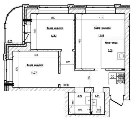 Общая площадь 57.7 м2