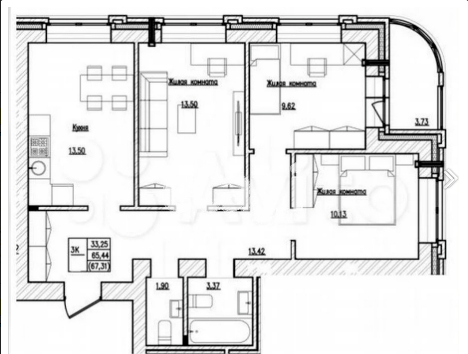 Большая кухня-гостиная 13,5 м2, раздельный сан.узел и три уютные спальни.