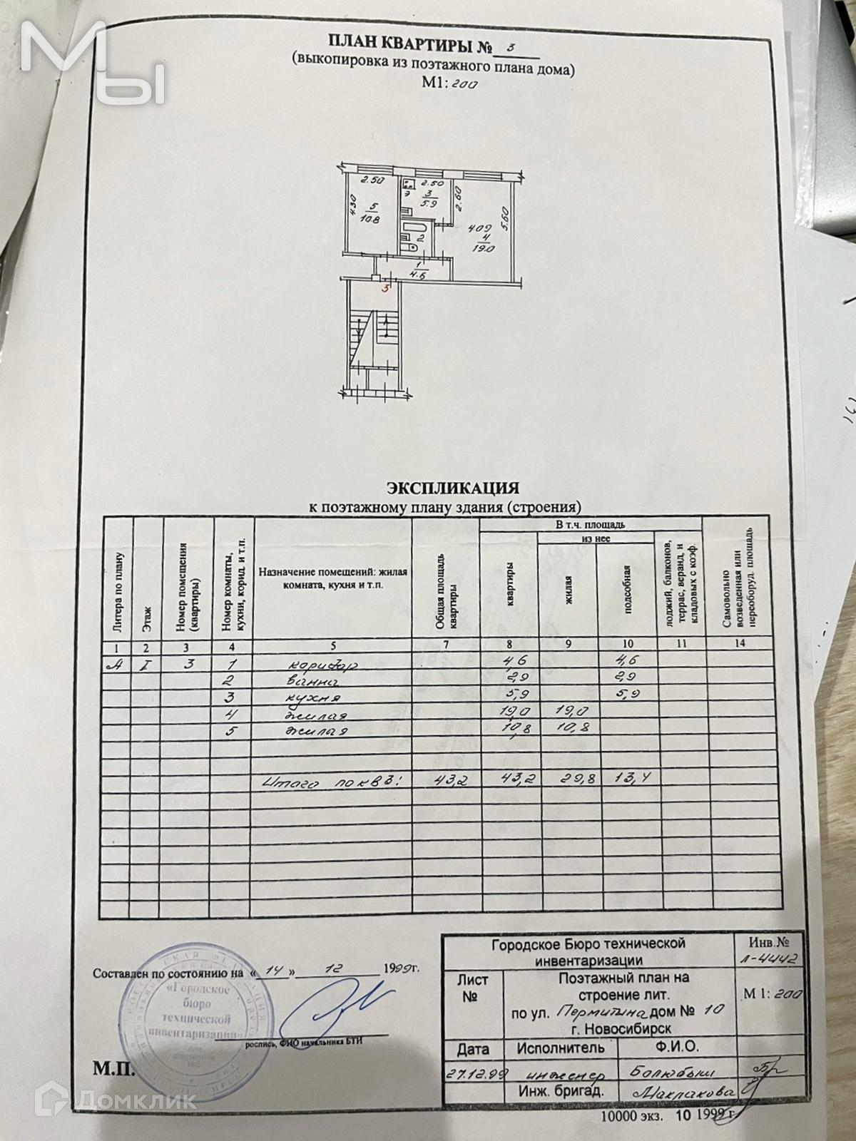 2-комнатная квартира, 43 м2, этаж 1 / 5, на продажу в Новосибирске, улица Пермитина, 10
