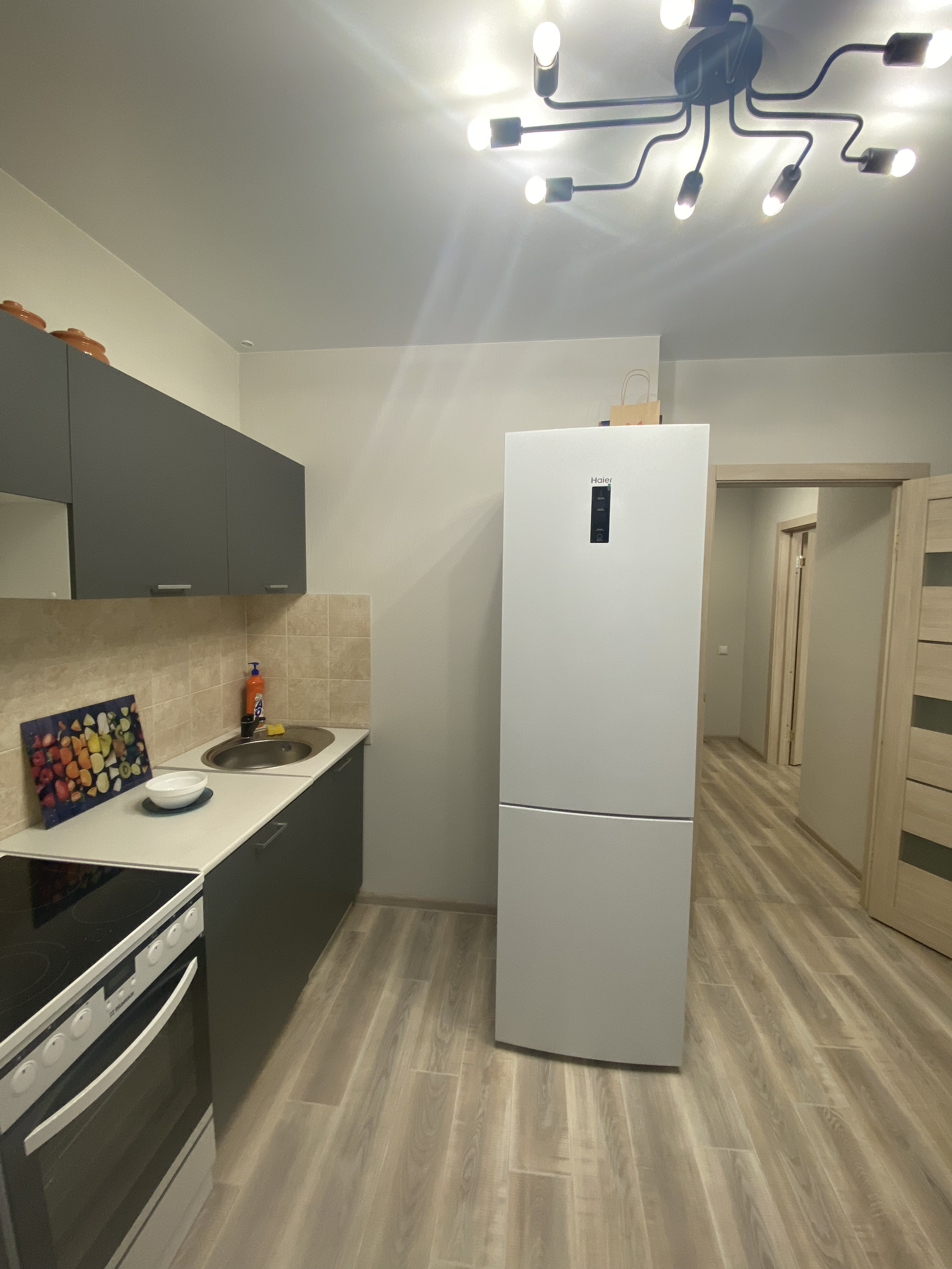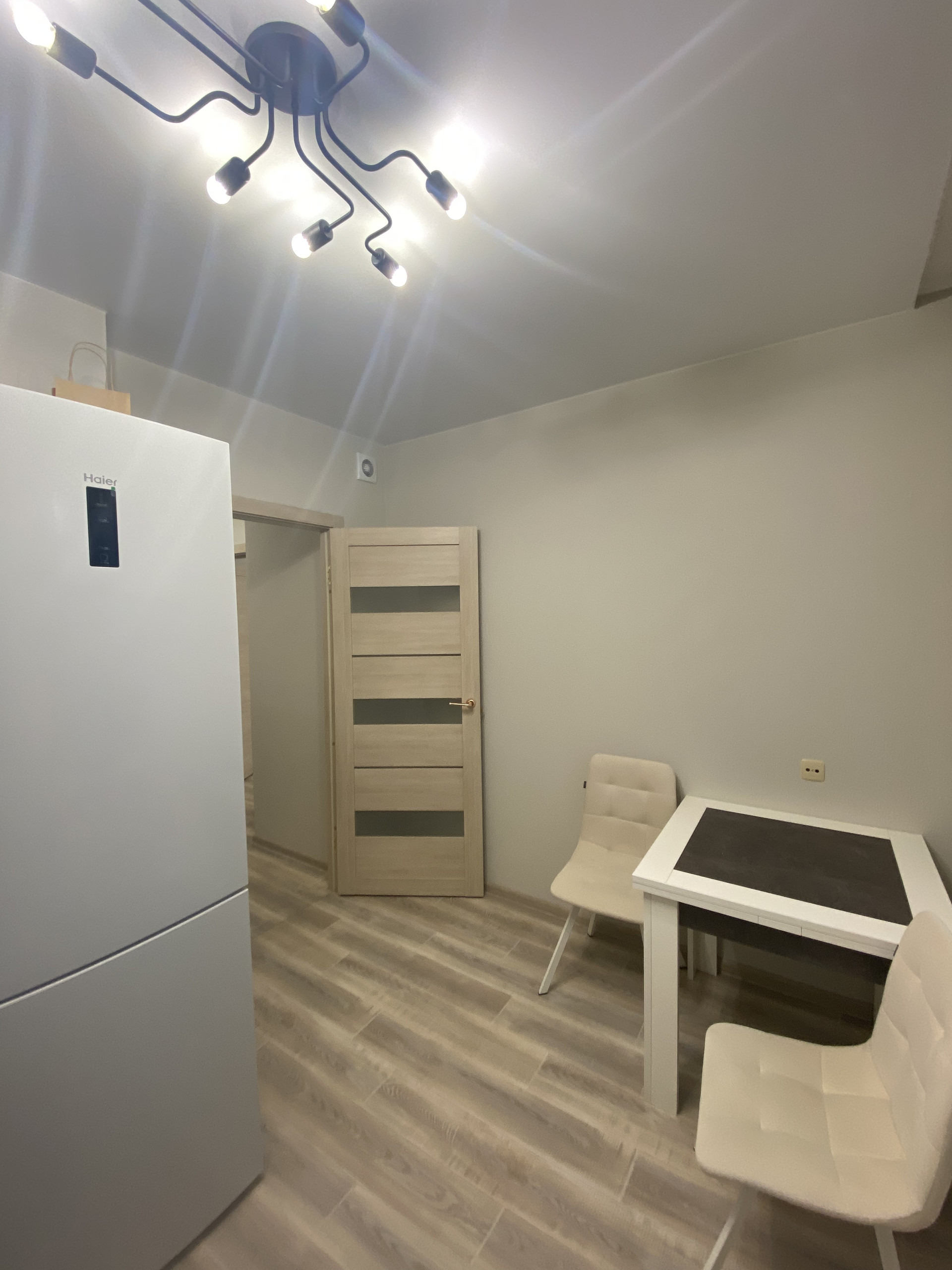 холодильник "Haier"; обеденная зона: стол и стулья