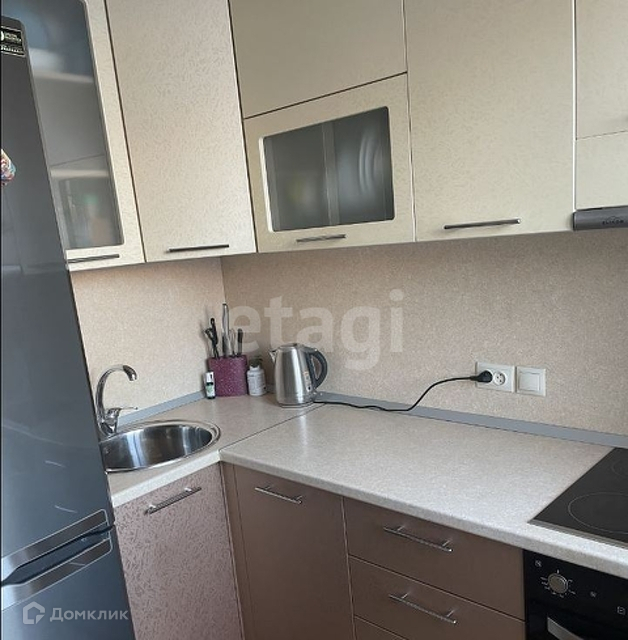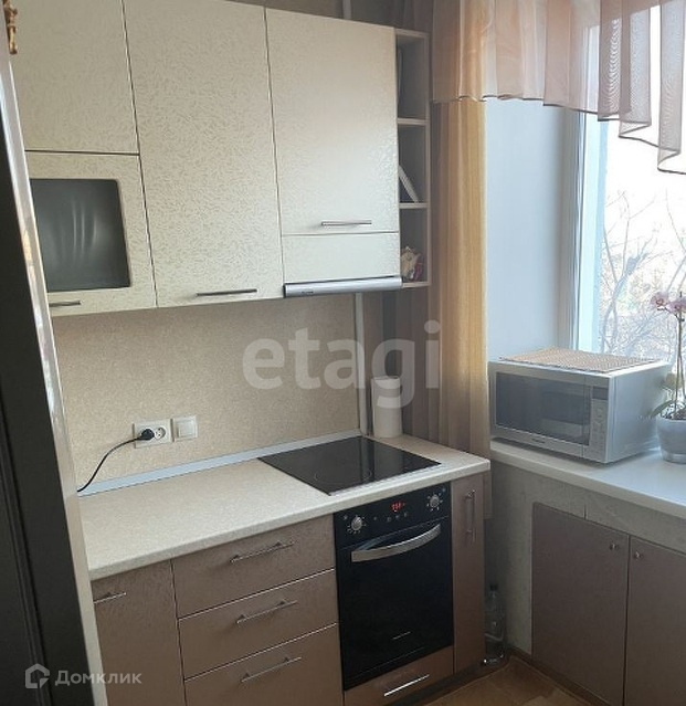 На кухне встроенная кухня с бытовой техникой (духовой шкаф, варочная поверхность), посудомойка. Плита электрическая. Фурнитура кухни - Blum, которая считается очень высокого качества и вечной.