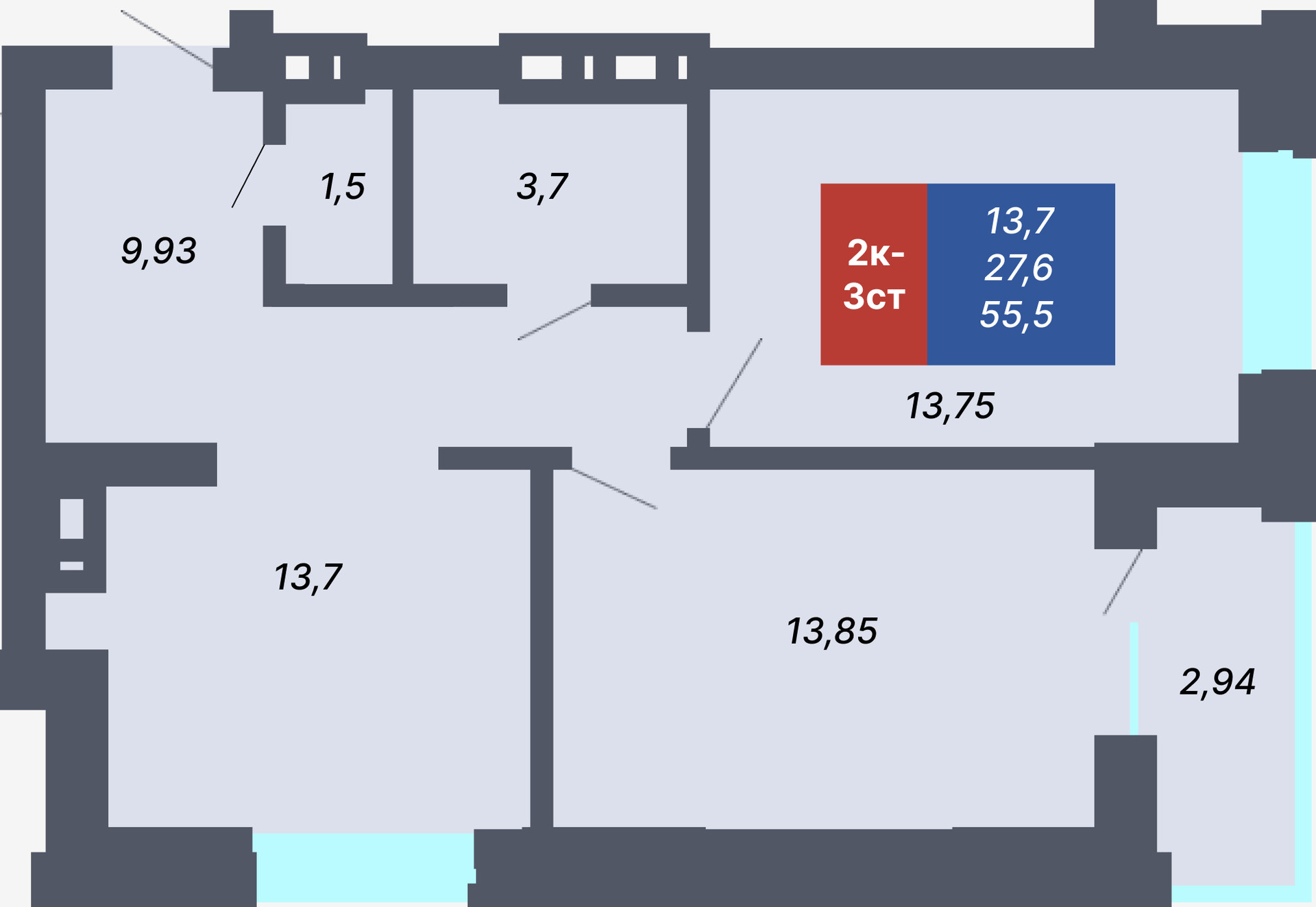 Общая площадь 55.5 м2