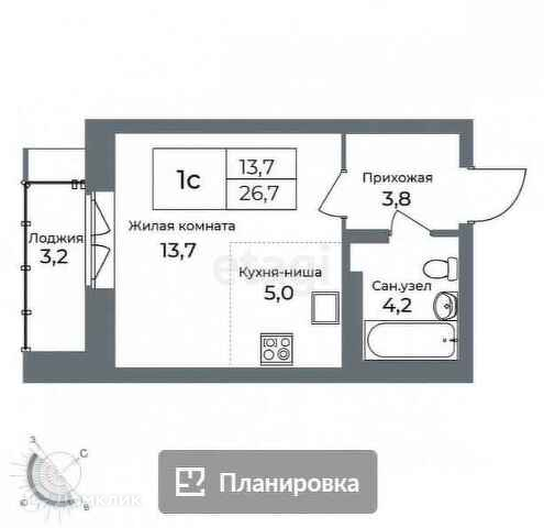 Общая площадь 26.3 м2