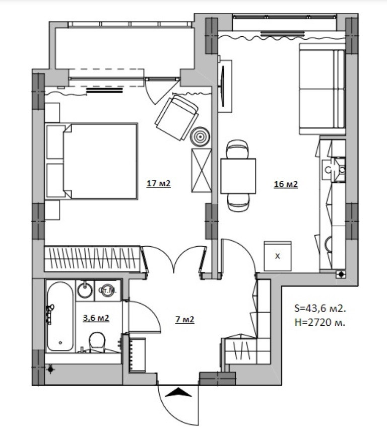 Общая площадь 43.6 м2