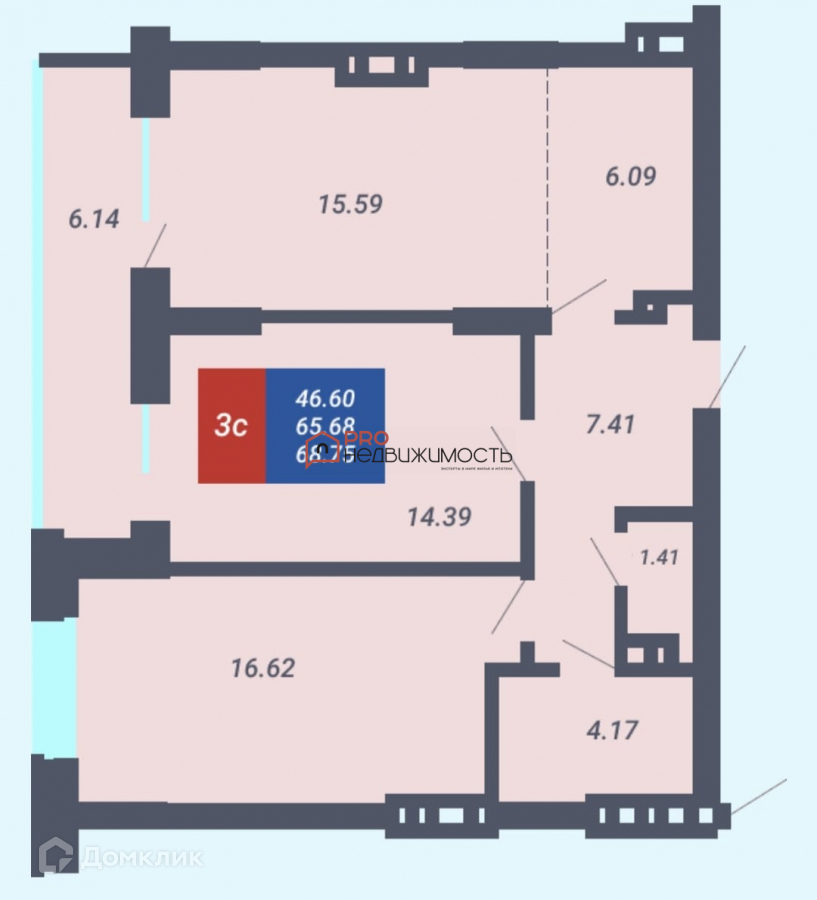 Общая площадь 65.68 м2