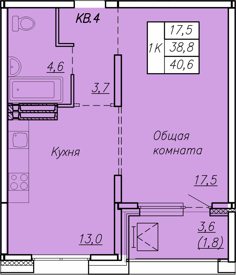 Общая площадь 40.6 м2