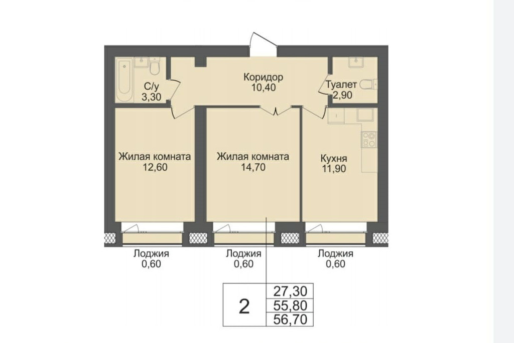 Общая площадь 55.8 м2