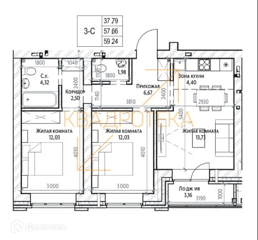 Общая площадь 59.24 м2