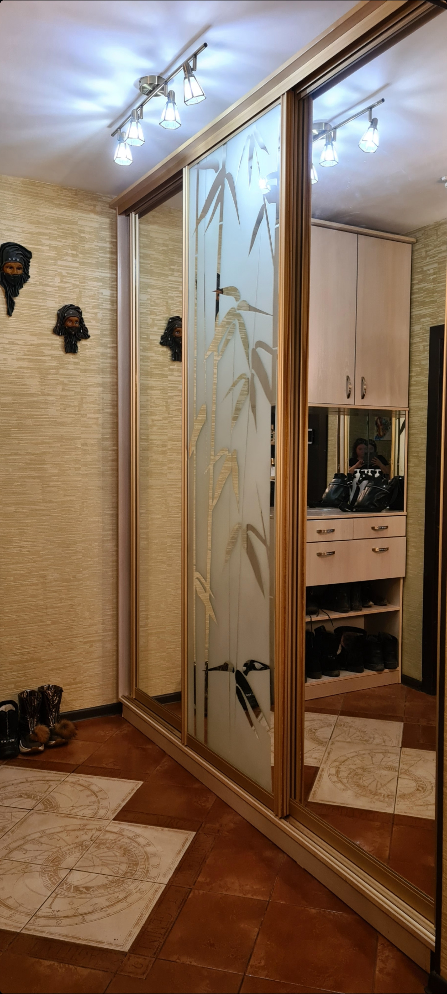 Лоджия утеплена, стены и потолок обшиты деревом. На лоджии встроен большой и вместительный шкаф, холодильник.