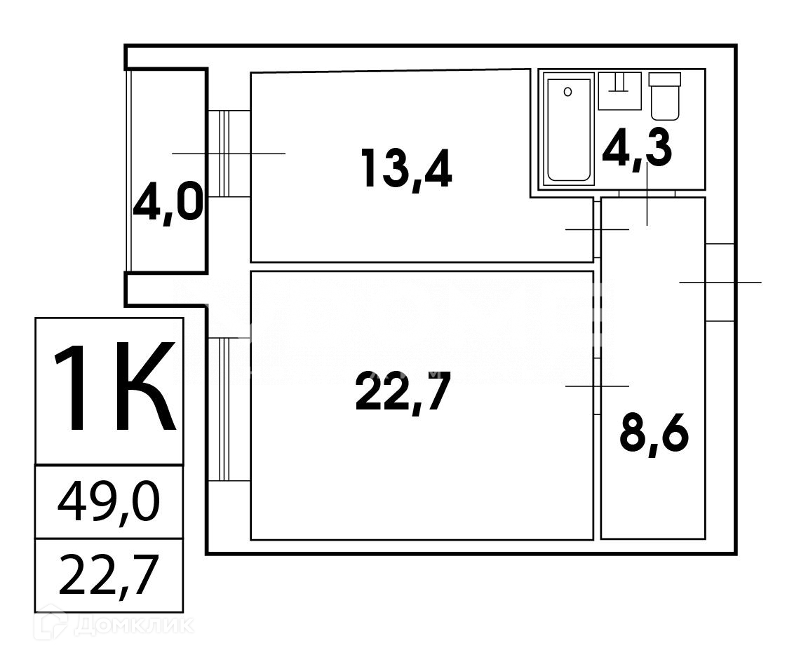 Жилая площадь 22.7 м2