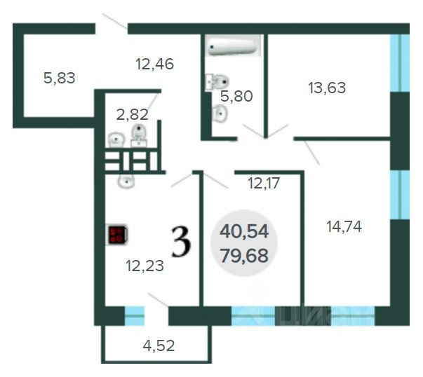 В продаже 3х-комнатная квартира в строящемся доме (Дом 30, БС Б), срок сдачи: IV-кв. 2022г. (ключи март 2023г.) , общей площадью 79.68 кв.м., на 4 этаже.