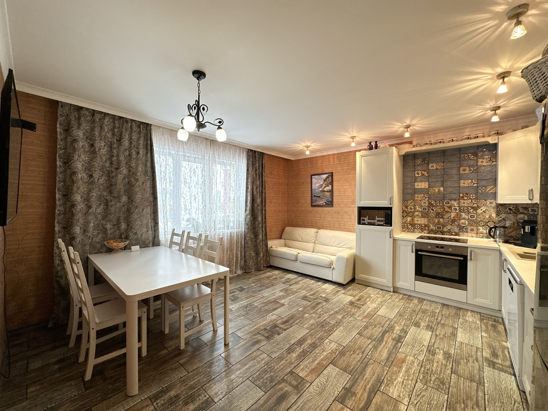 Очень уютная просторная кухня 21.3м полностью оснащена мебелью и дорогостоящей бытовой техникой. Все в отличном состоянии!