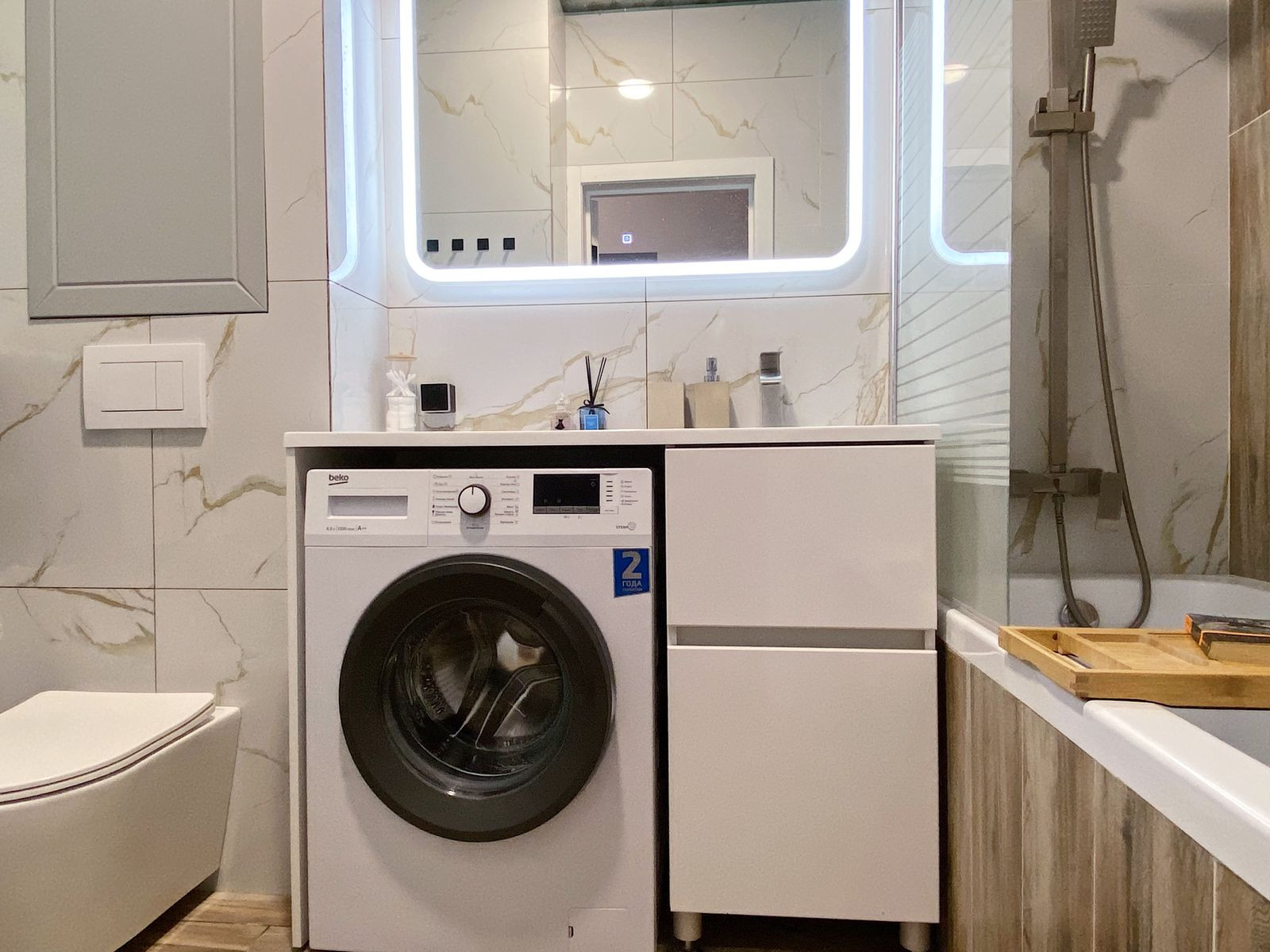 С/У : Ванна акриловая 1,7м, подвесной унитаз, тумба с раковиной над стиральной машиной 1,1м, стиральная машина, водонагреватель.
