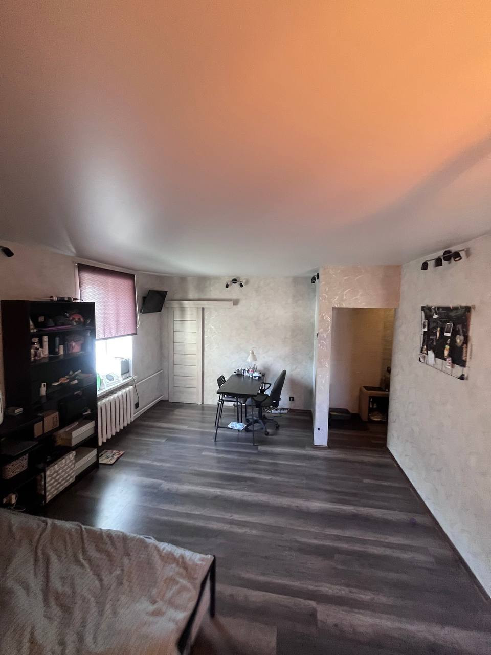 В коридоре декоративная штукатурка на стенах, в комнатах обои наклеены месяц назад, на полу качественный ламинат. Контурное освещение под потолком, а также дизайнерские лампы накаливания над барной стойкой.