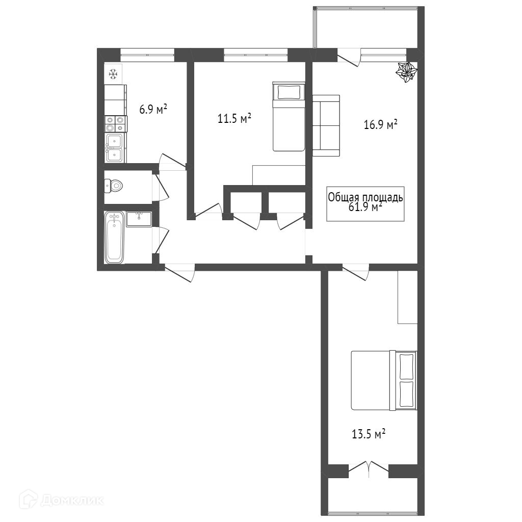 Общая площадь 61.9 м2