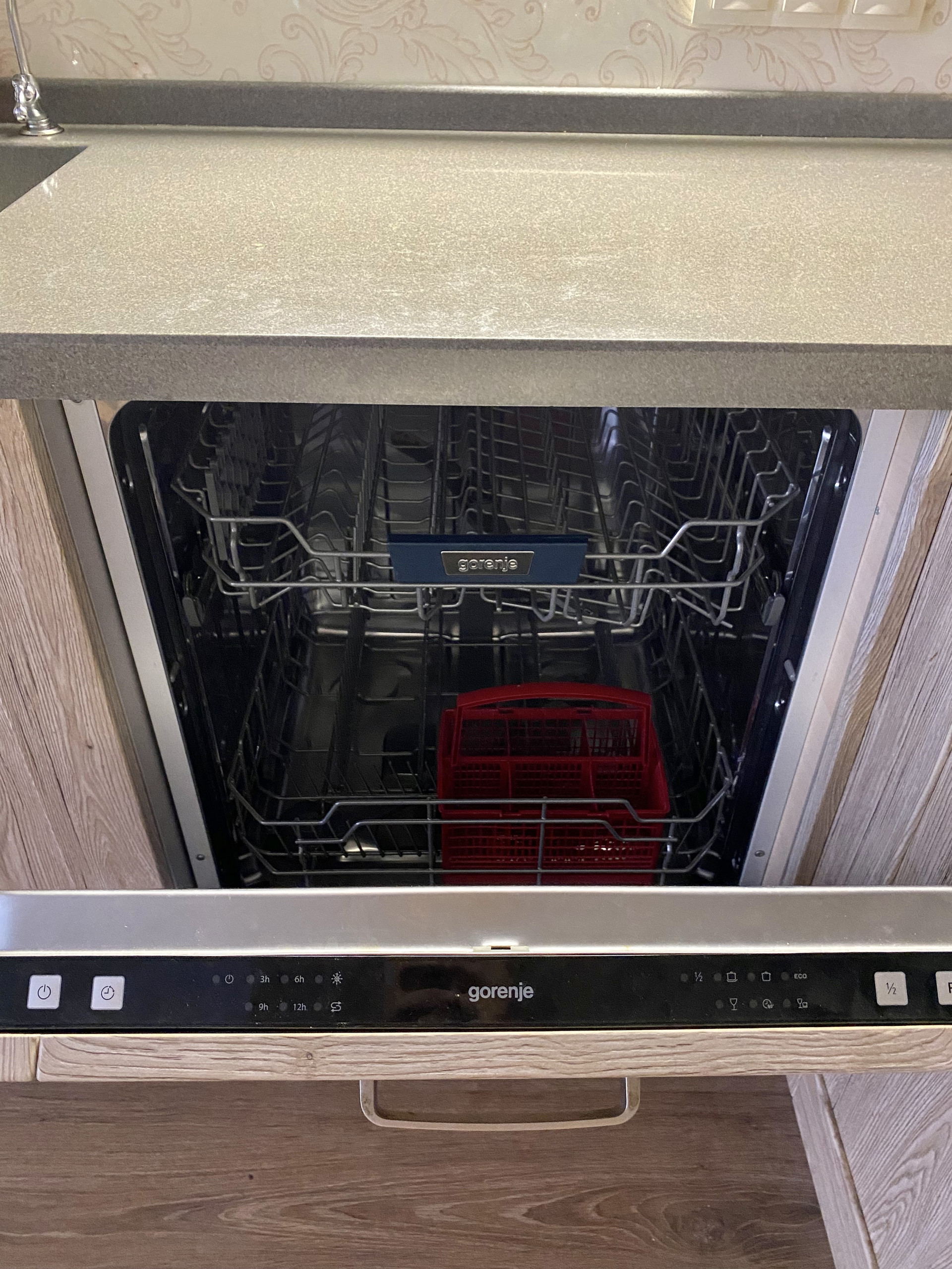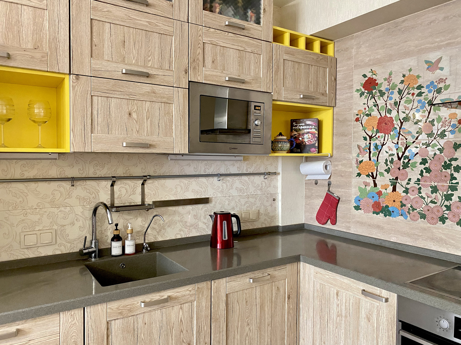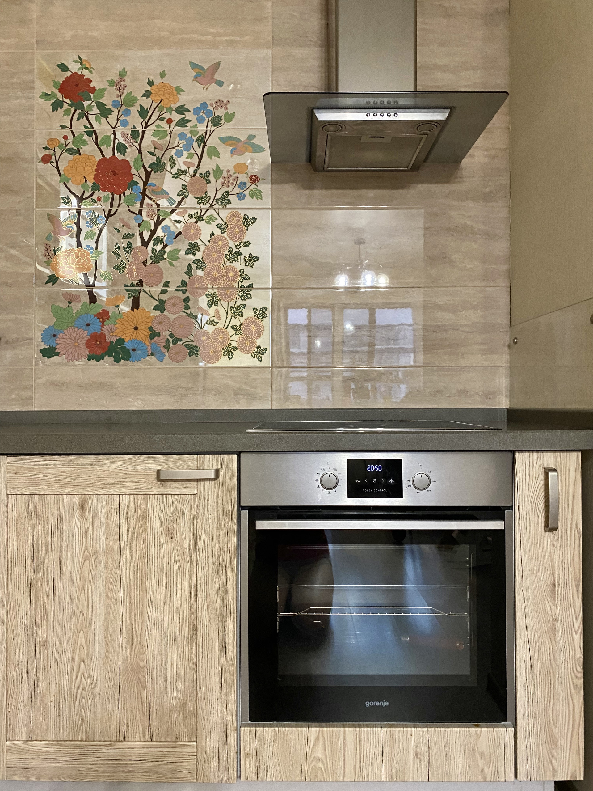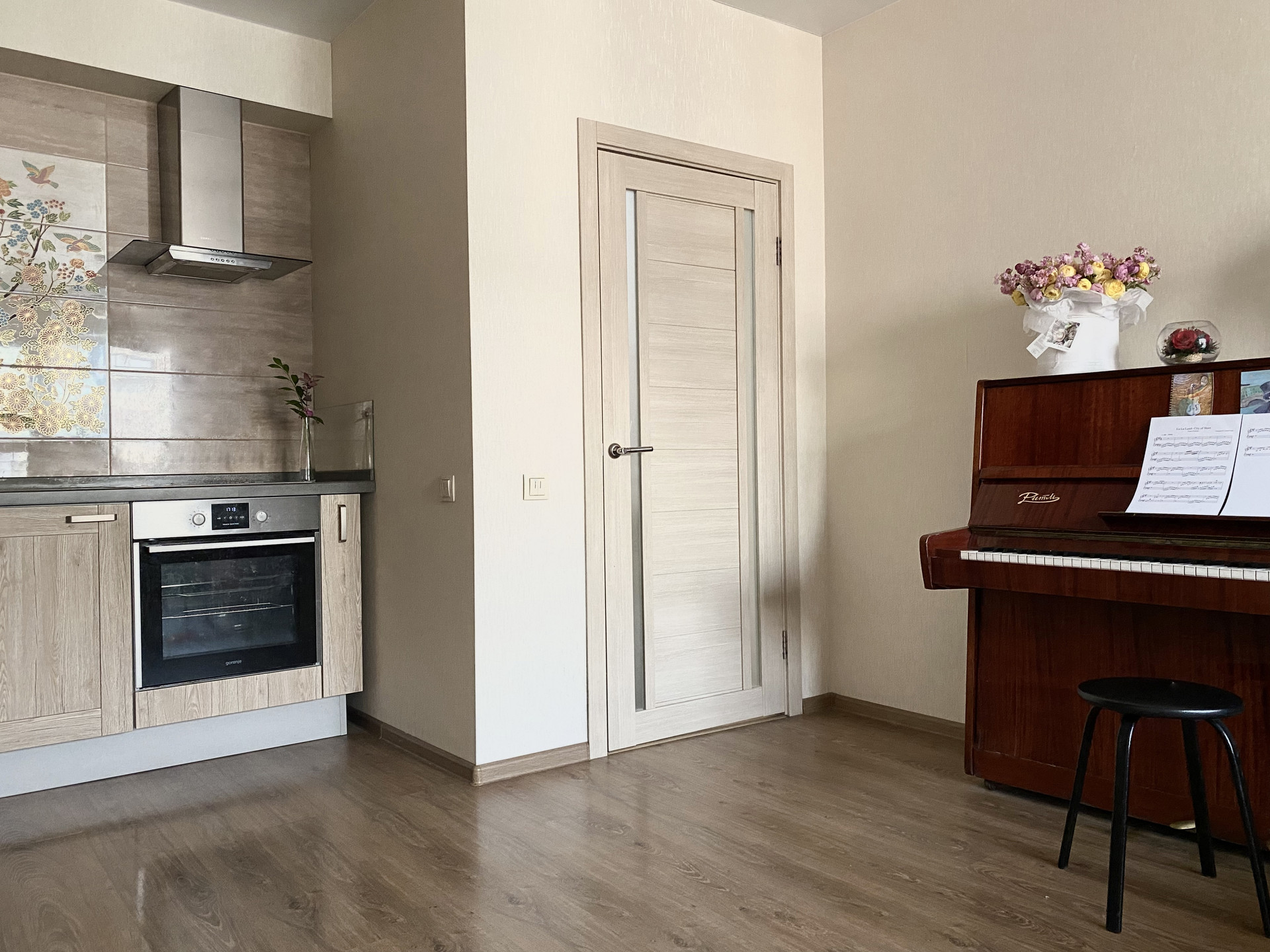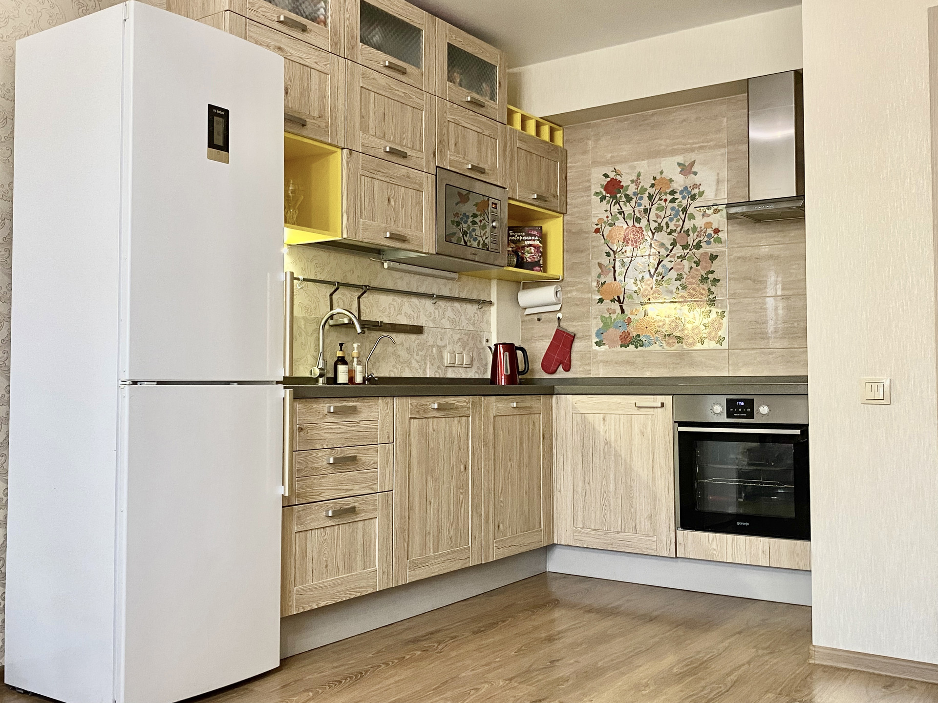 Гостиная совмещена с кухней. Сама кухня сделана под заказ студией «Мария». Это настоящая изюминка гостиной. Кухня вместительная, стильная, в центре фартука выложено эффектное панно. При проектировании кухни мы взяли за основу правило «золотого треугольника», а значит кухня максимально эргономична и функциональна. Оснащение кухни - это ведущие производители высочайшего класса: фурнитура Blum, встроенная микроволновка Indesit, встроенная посудомойка Gorenje 60 см, встроенный духовой шкаф Gorenje, встроенная варочная панель Electrolux, вытяжка Kuppersberg. Вся техника остаётся при продаже. Цельная каменная столешница, удобная квадратная раковина 50*50 см и глубиной 22 см, итальянский смеситель. Кухня оснащена необходимым количеством розеток и мест хранения.