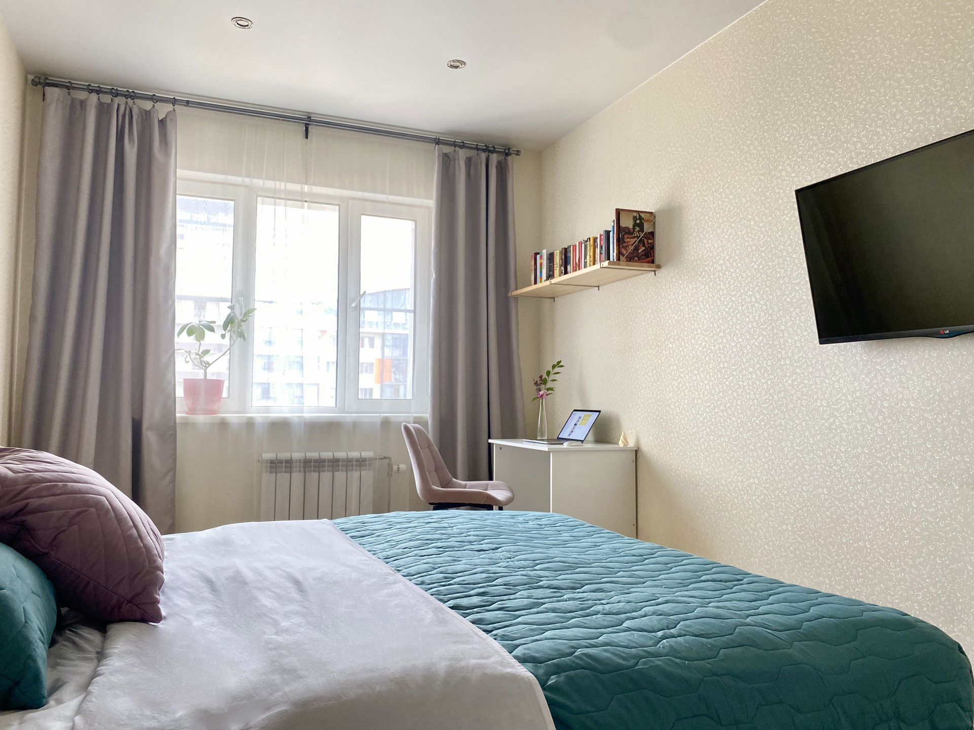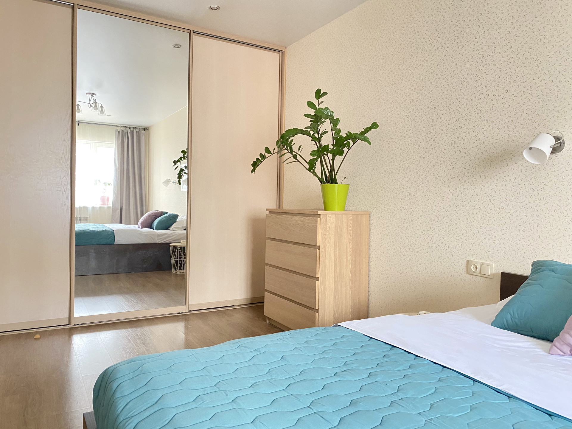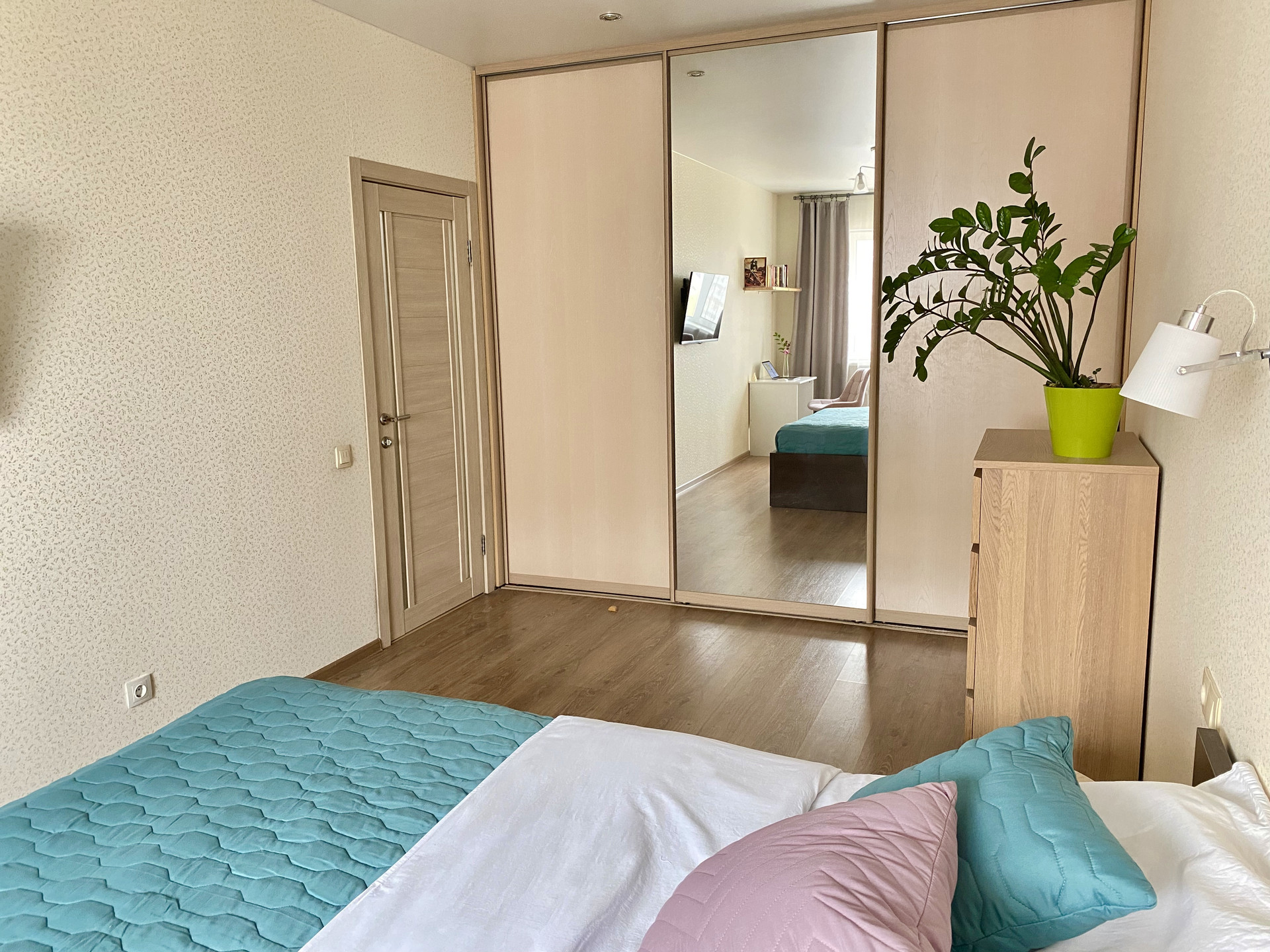 Спальня просторная и уютная, есть встроенный шкаф с зеркалом в полный рост (также остаётся при продаже). В спальне также достаточно площади для организации рабочей зоны или дополнительного места отдыха.