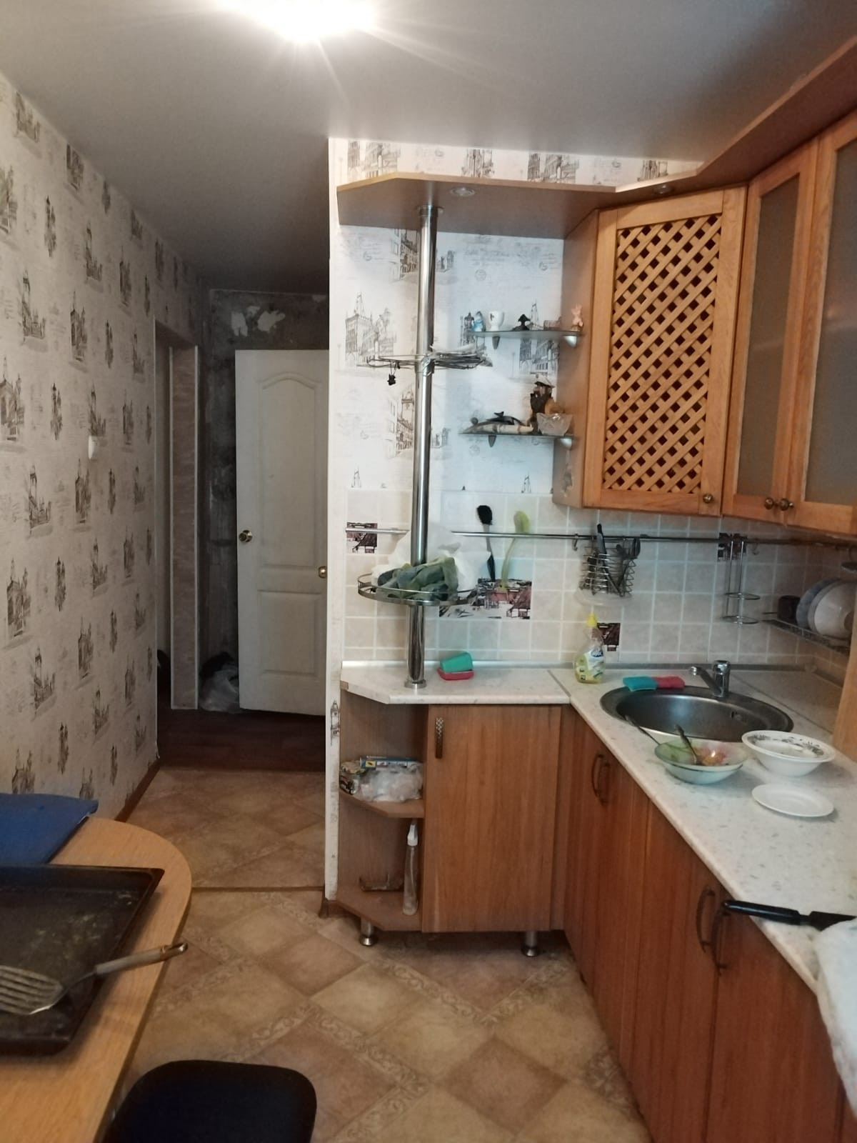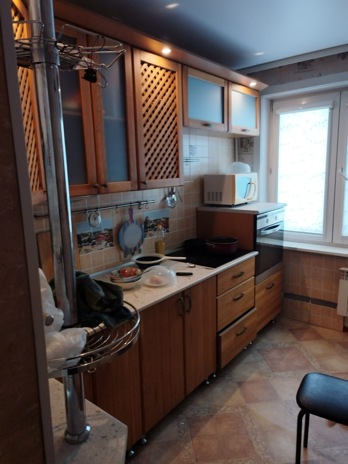 В подарок новым владельцам остается шикарный кухонный гарнитур и вместительный встроенный шкаф.