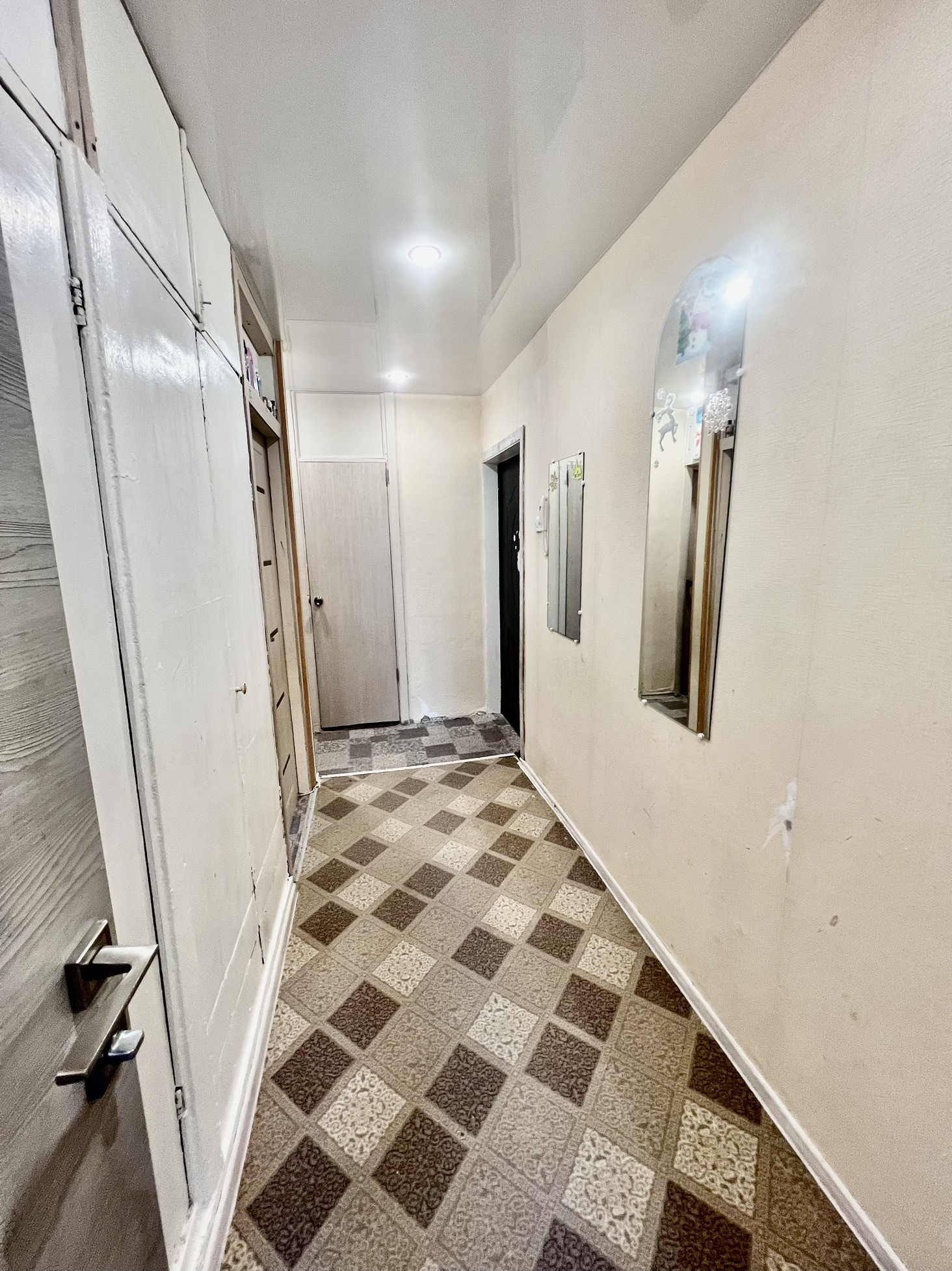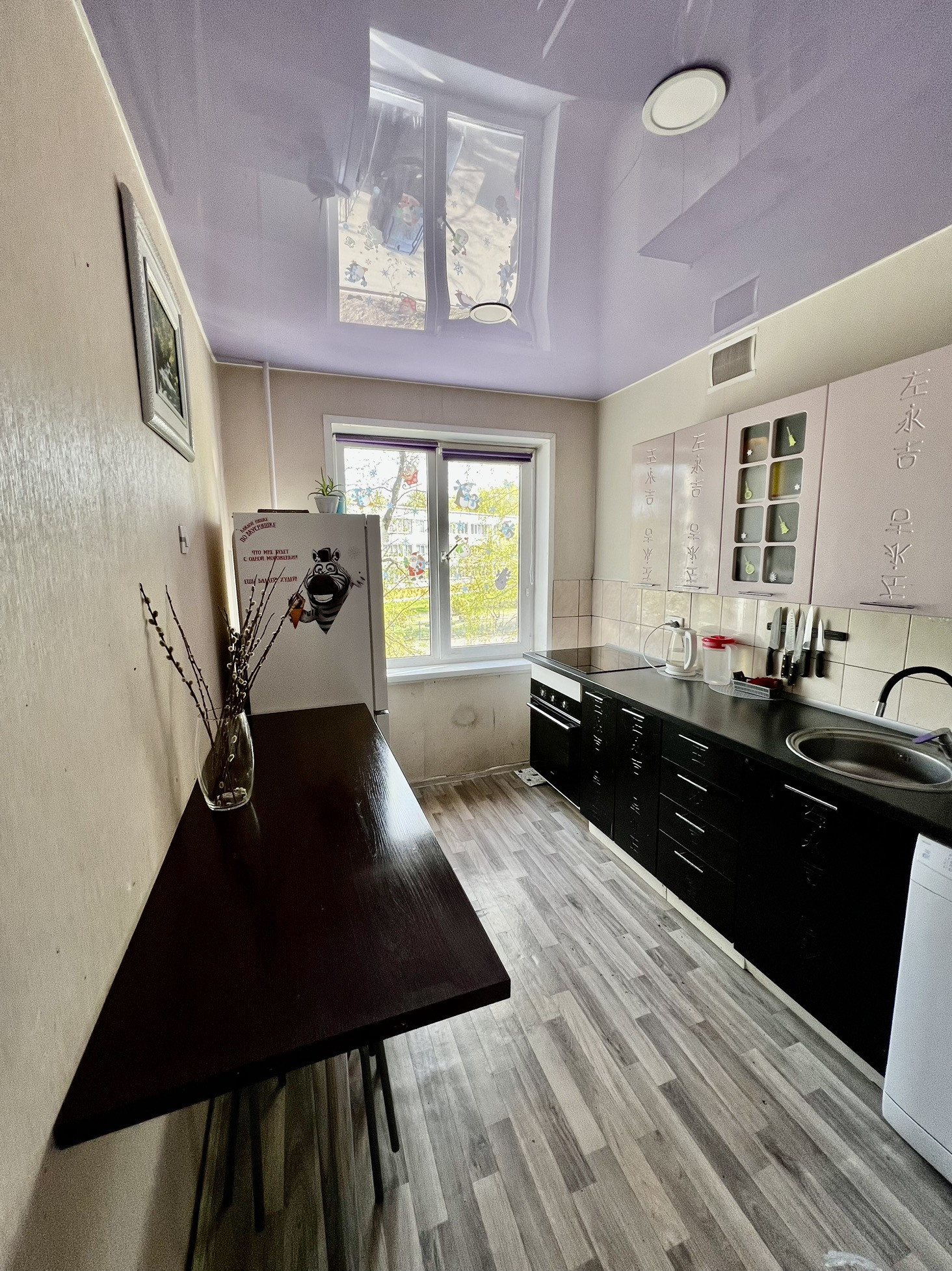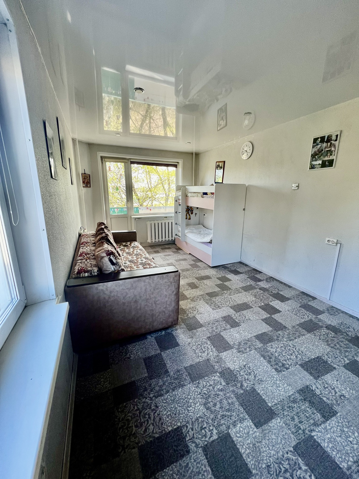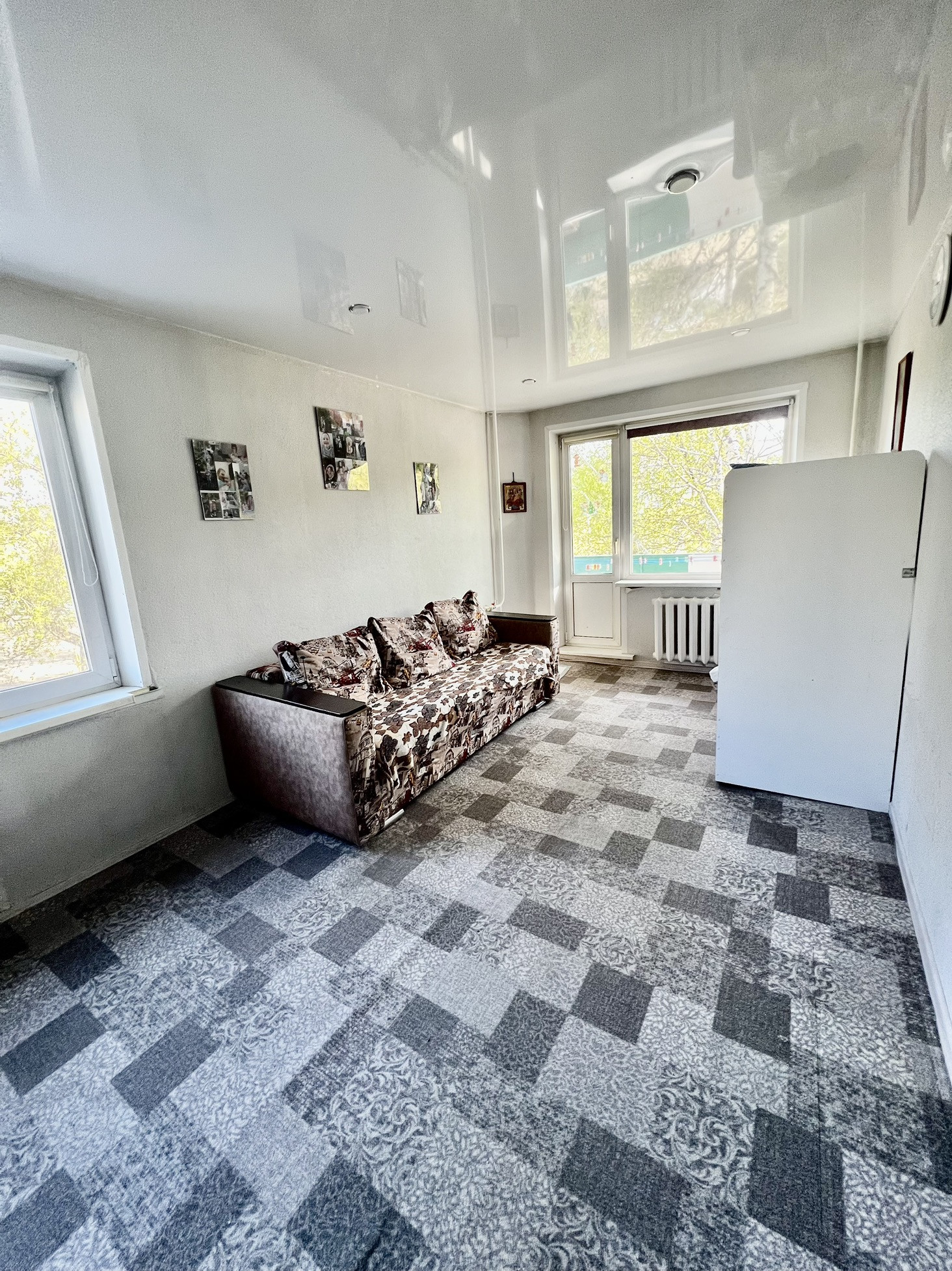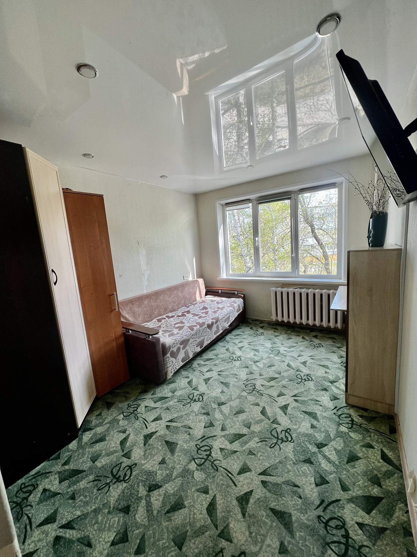В квартире везде натяжные потолки. В одной из комнат два окна, что делают комнату еще светлей.
