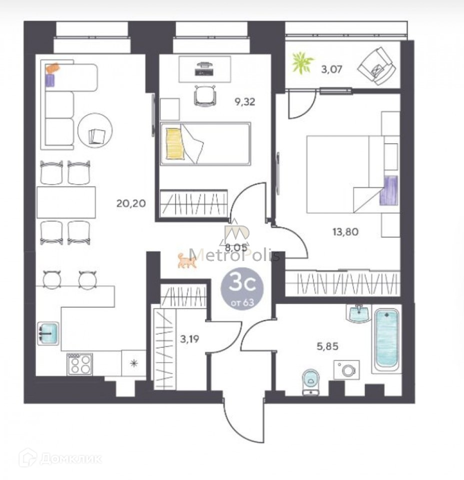 Общая площадь 60.5 м2