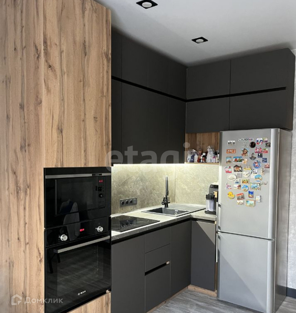 Установлен кухонный гарнитур с бытовой техникой.