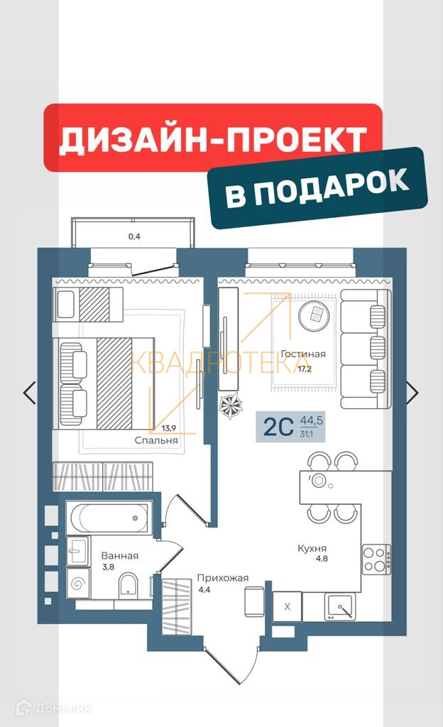 Общая площадь 44 м2
